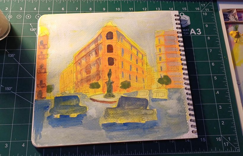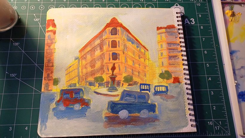 Once the sketch was complete, I moved on to establishing the color foundation. I wanted the palette to feel true to Cairo—not just visually, but emotionally. The city is often bathed in warm sunlight, and there's a certain golden haze that lingers in the air. To capture that feeling, I began by laying down a base of yellow across the scene.