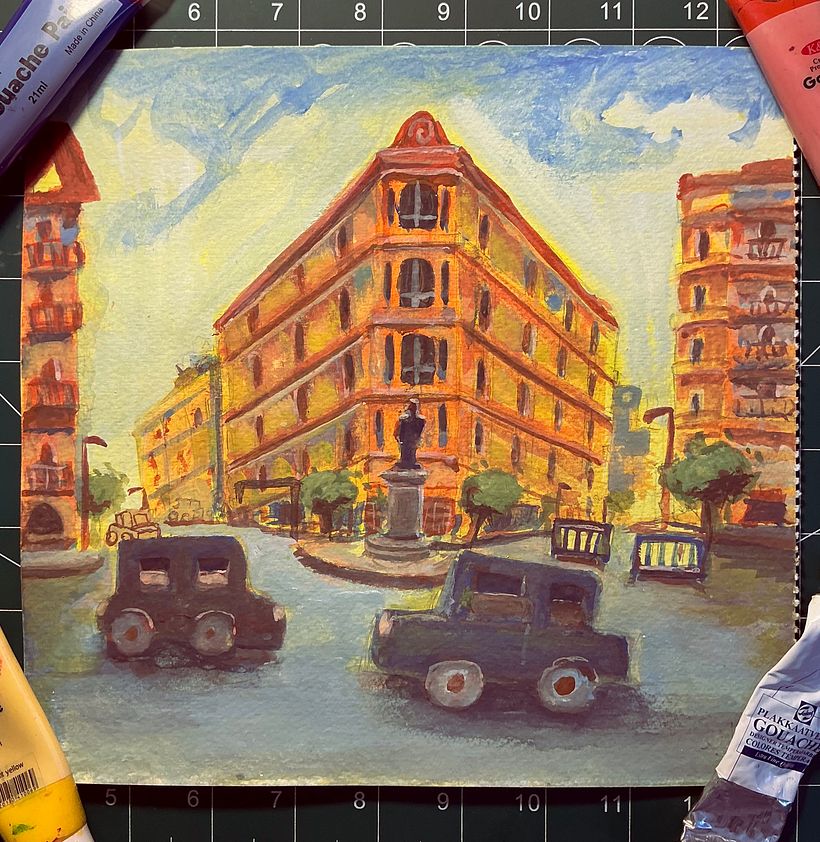 I created this painting of Talaat Harb Street, one of the most iconic and historically rich areas in downtown Cairo. The project was my response to a Domestika art challenge that arrived at a time when I felt slightly disconnected from my creative routine. I wasn’t blocked, but I hadn’t drawn in a while, and the challenge gave me the perfect motivation to start again with fresh energy.