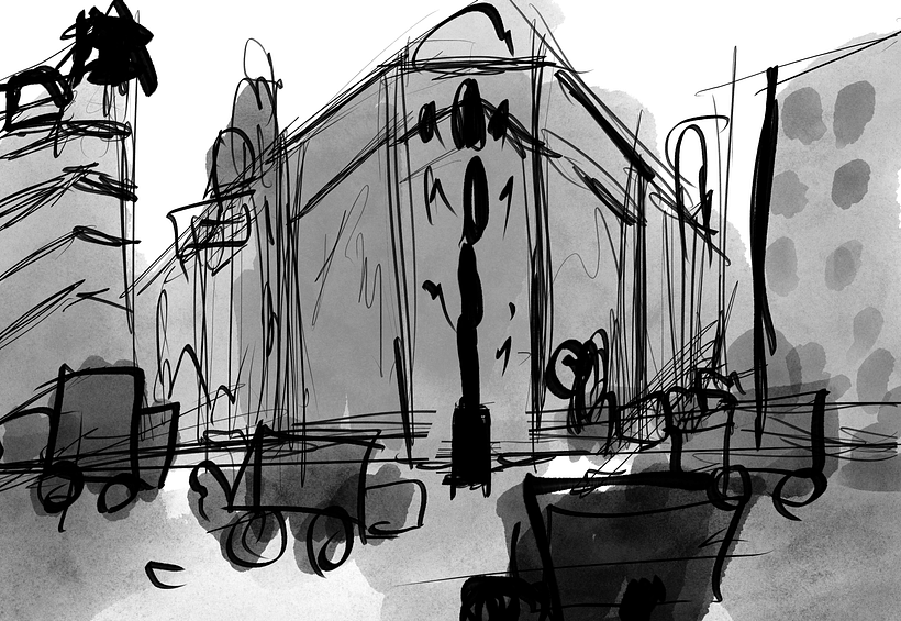 One interesting part of the process was the car in the lower right. I initially placed it as part of the composition "off instinct," but as the sketch evolved, I realized it disrupted the visual balance. I adjusted its placement and size, which led to a stronger, more harmonious composition in the final sketch.