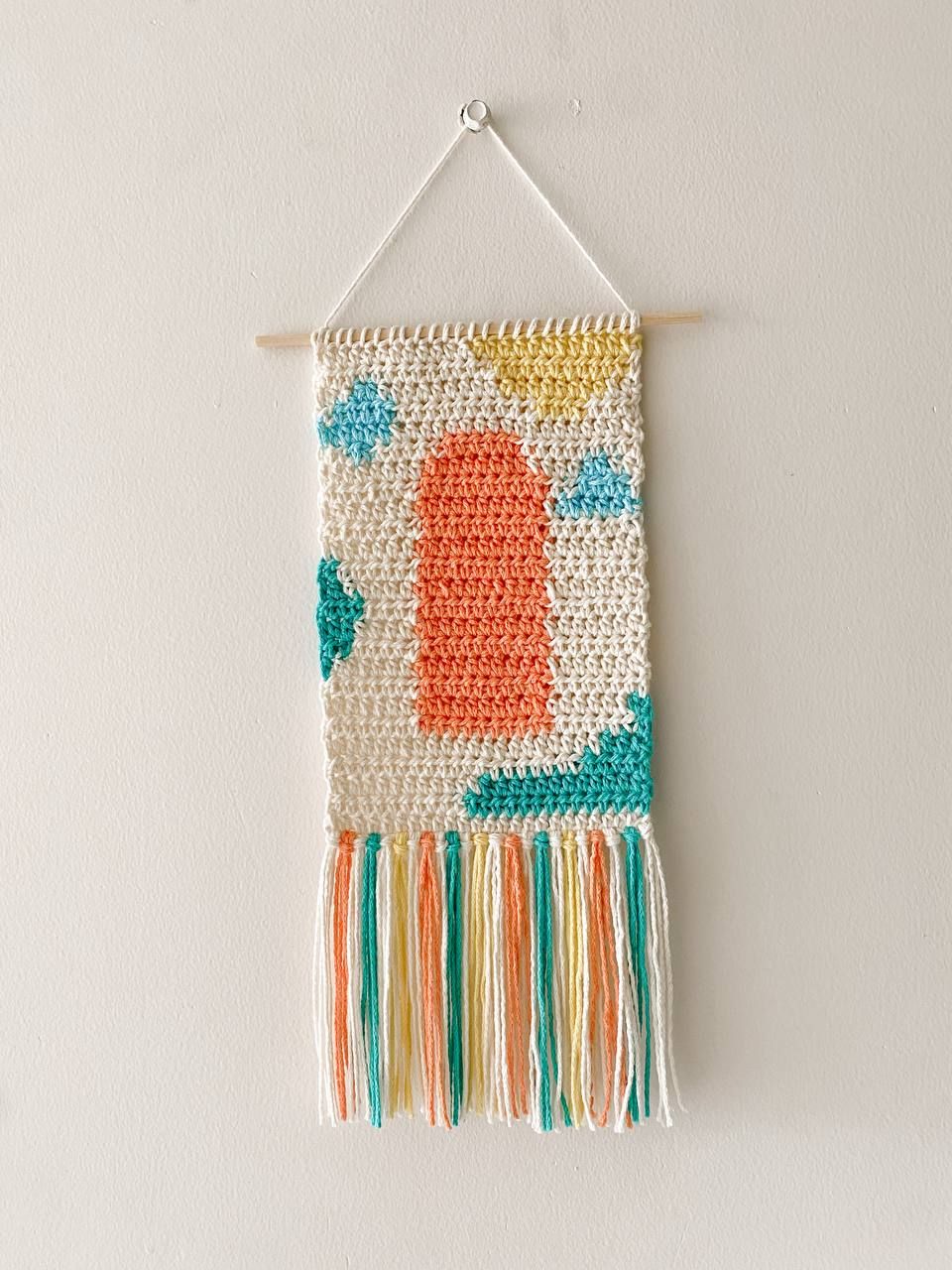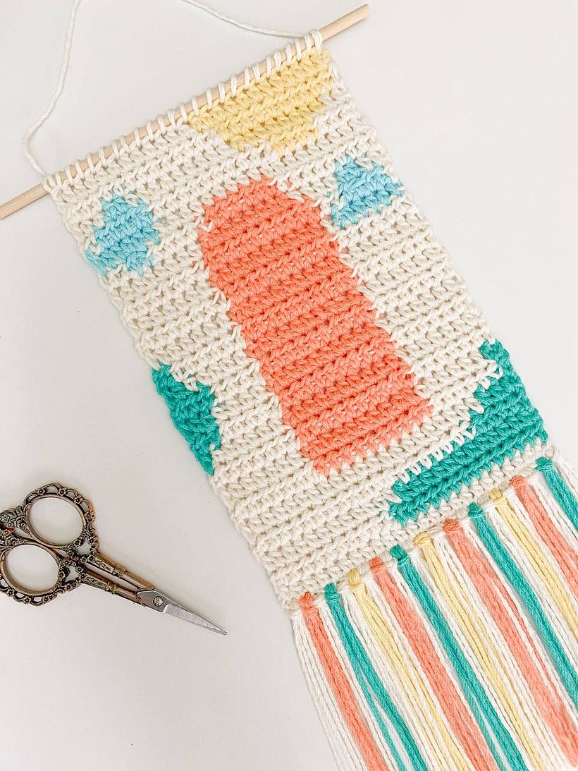 Después de ver todos los módulos del Curso, quise aventurarme a crear mi propio tapiz, utilicé elementos muy sencillos por ser la primera vez que practico la técnica de intarsia. Me inspiré en figuras geométricas simples y mi boceto lo hice desde canva. Luego lo trasladé a una grilla con Stitchfiddle, lo nombré Tapiz Mérida que representa la provincia de Yucatán México. Un pueblo mágico que marcó mi vida.