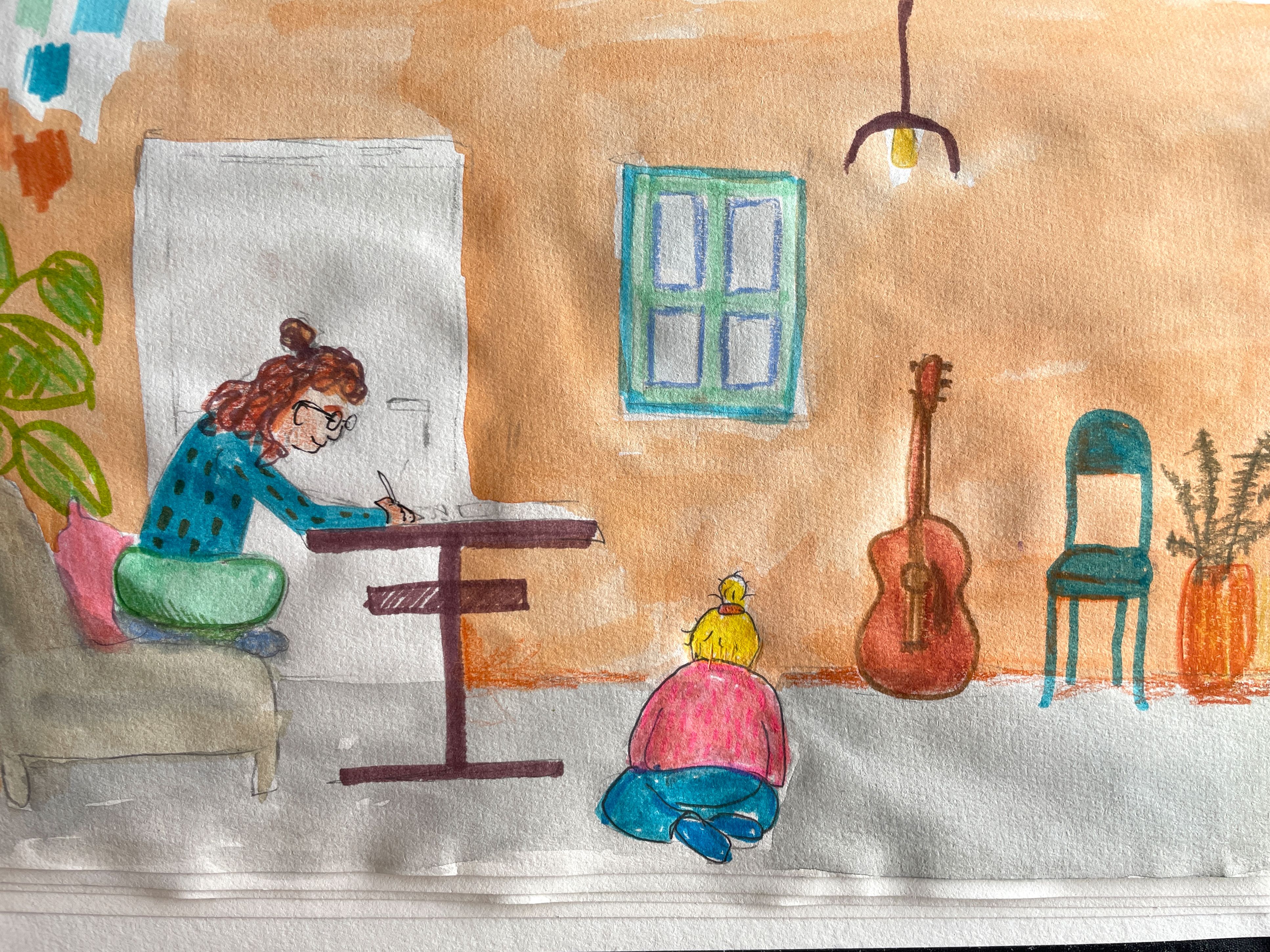 Die Skizze, die dabei entstanden ist, zeigt genau diesen Versuch. Zwei Figuren in einem warmen Raum – eine Welt zwischen Alltag und innerer Geschichte. Die Linien sind einfacher, die Formen spielerisch-naiv, fast kindlich. Und obwohl es nicht mein typischer Stil ist, spüre ich: etwas Echtes schwingt mit.