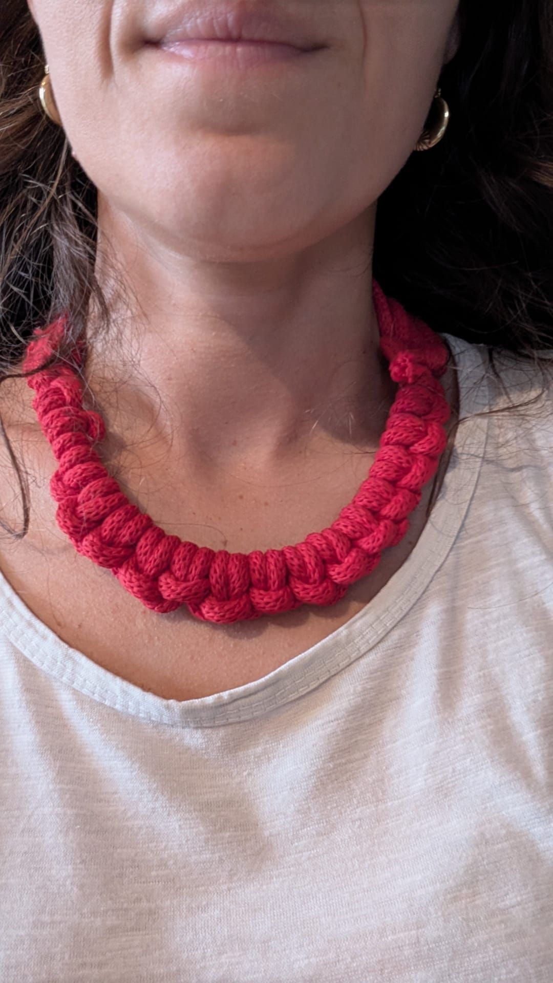 Non ho trovato tutti i materiali suggeriti...ma ho voluto mettere subito in pratica gli insegnamenti di Beth con ciò che sono riuscita a reperire in breve tempo! Ho usato una corda rossa di 6mm, e una corda da 4mm con filo da ricamo che avevo già in casa