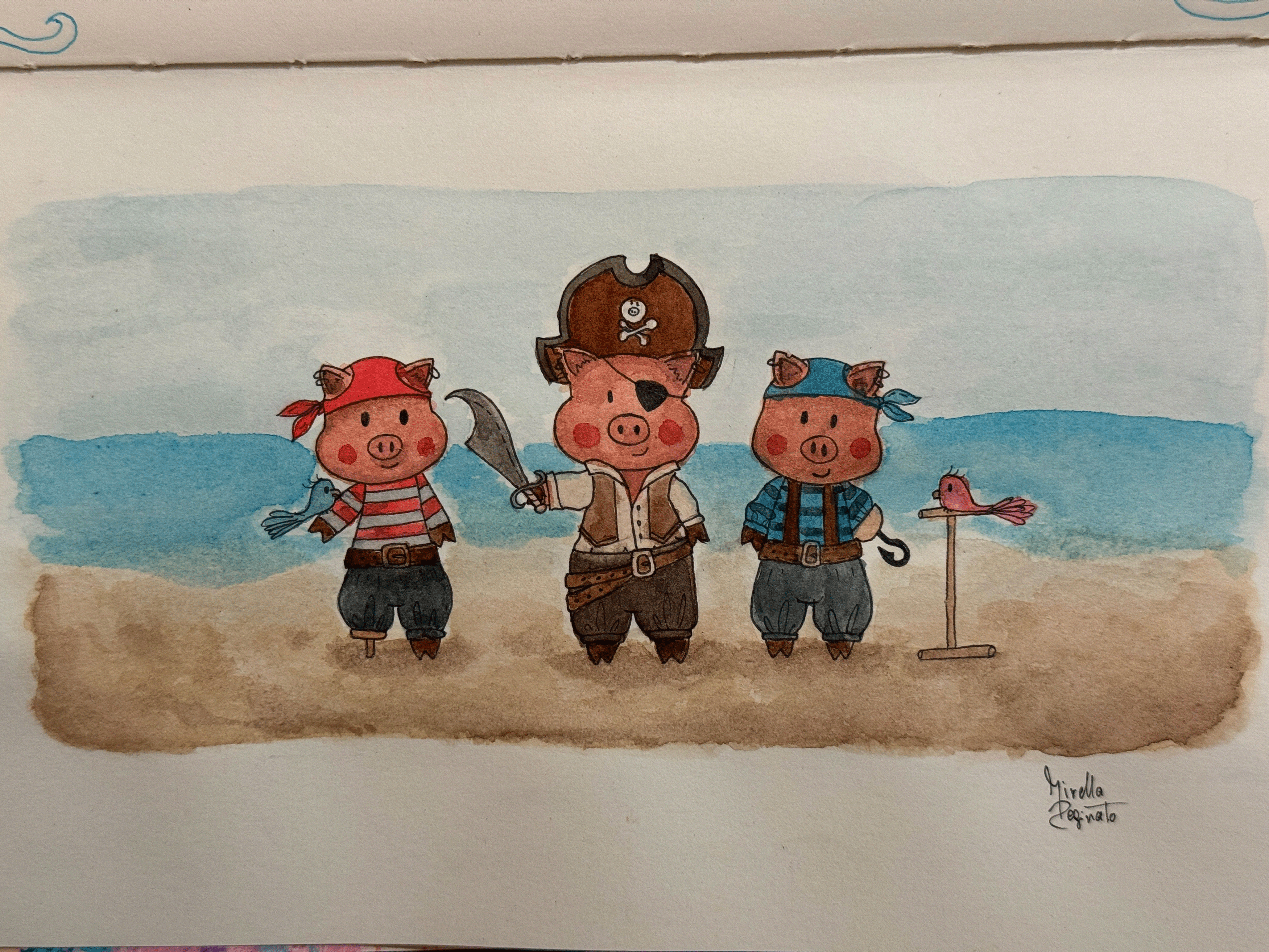 Decidi recriar Os Três Porquinhos como piratas, cada um com uma das "características especiais" retratadas nos mesmos: um usando perna de pau, outro usando gancho onde seria sua mão, e ainda o terceiro usando tapa-olho. Trabalhei com aquarela e caneta para os contornos, gostei do resultado!