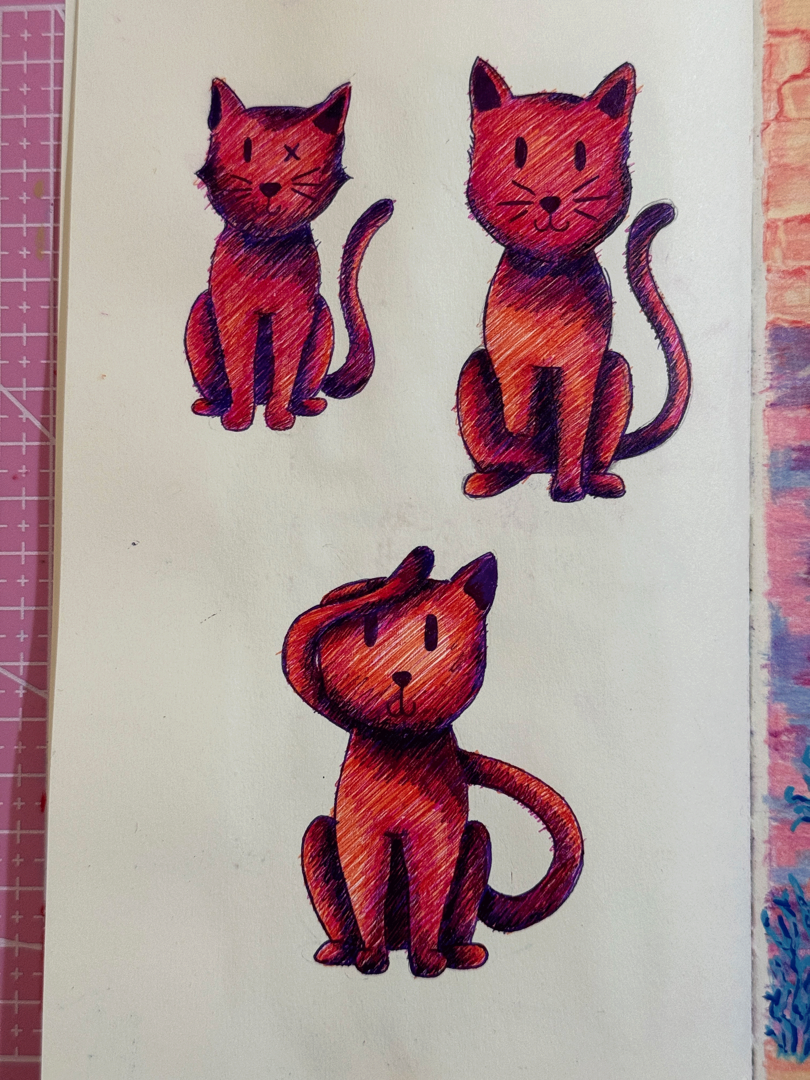 Demorei pra me decidir em que tipo de personagem faria, então lembrei de Dom Gato, meu gatinho de estimação que tem apenas um olho, e decidi retrar os felinos no meu estilo!