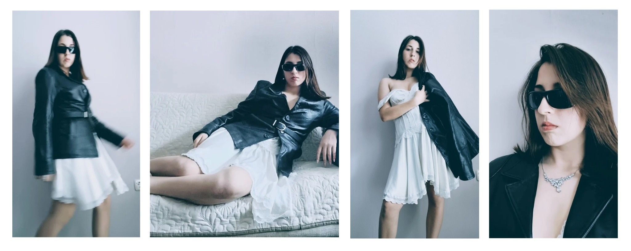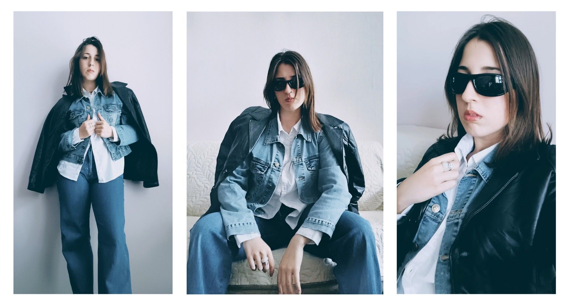 Since I didn’t have the opportunity to have a model, I styled and modeled the looks myself using pieces from my own wardrobe. I paired the black leather jacket with denim, a silk dress, a button-down shirt, a belt, and various accessories, creating different outfits that highlight the jacket’s adaptability.