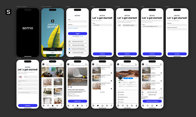 Desenvolvi o design de interface (UI) de alta fidelidade para o SENTIO, um aplicativo móvel de e-commerce focado em mobiliário e decoração moderna.