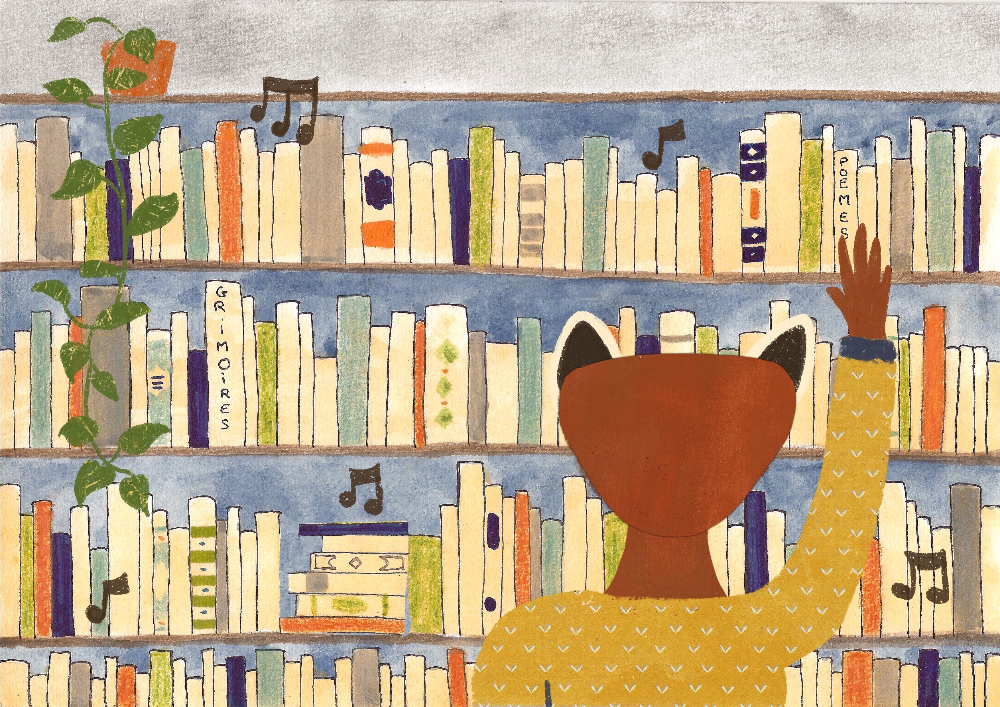 Abigail est dans son coin bibliothèque et choisit un livre
