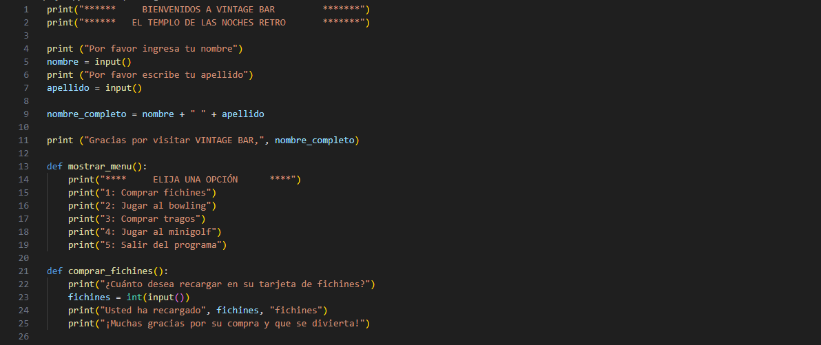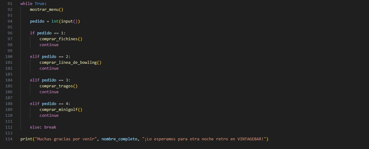 Por último, ingresé una opción para que el usuario saliera del programa y así evitar la iteración infinita mediante la función "break". Debajo imprimí un mensaje que le daba las gracias y que lo esperábamos para otra noche en el bar.