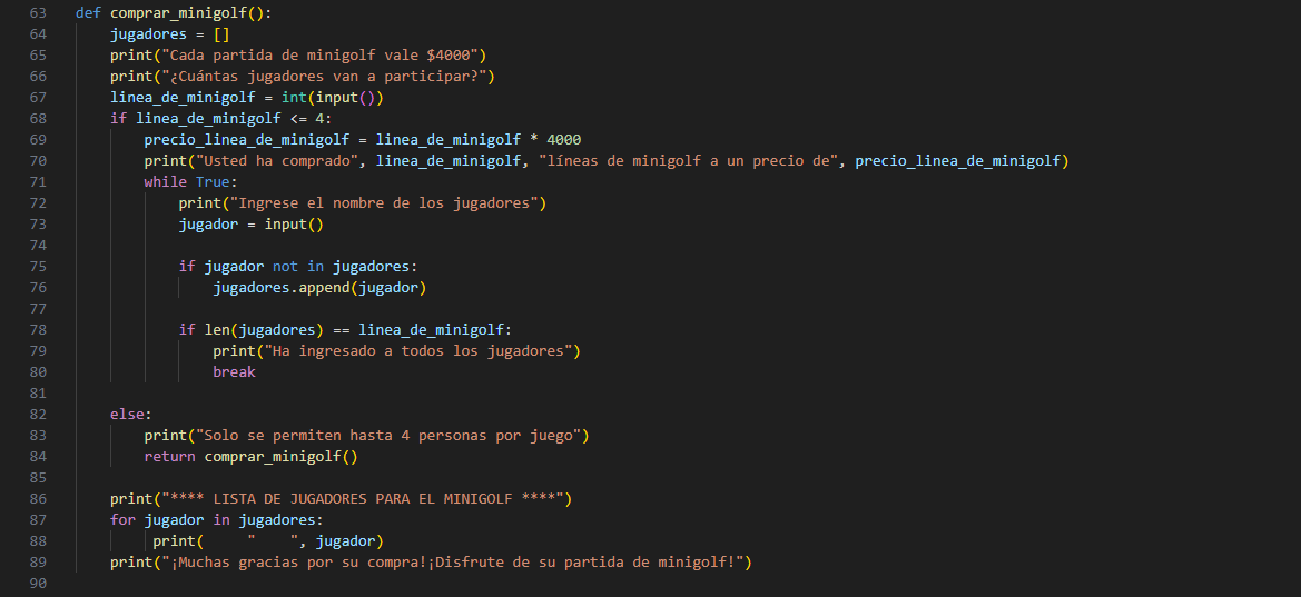 Después, definí la opción para comprar líneas de bowling donde creé la lista de los jugadores. En este caso, usé validaciones para limitar la compra de líneas de bowling a 10 mediante la función "if". Hice el cálculo de las líneas de bowling por el precio e imprimí el precio total multiplicando el precio de 1 por las que compró el usuario. Inserte una condición para que volviera a introducir las líneas de bowling si se pasaba de 10 con la función "else". Después de comprar las líneas de bowling, ingrese una validación infinita con "while True" y le pedí al usuario que ingrese el nombre de cada uno de los jugadores y designe la variable "jugador" igual a "input()". Escribí dos validaciones: una en caso de que el nombre no se encontrará para que lo agregará a la lista de jugadores y otra en la cual si la longitud de la lista de jugadores era igual a las líneas de bowling, que le dijera al usuario que ya había ingresado todos los jugadores e introduje la función "break". Por último, se imprime la lista de jugadores y un mensaje para que disfrute el juego. El mismo procedimiento aplique con las líneas de minigolf solo que en lugar de 10 jugadores permití un máximo de 4.