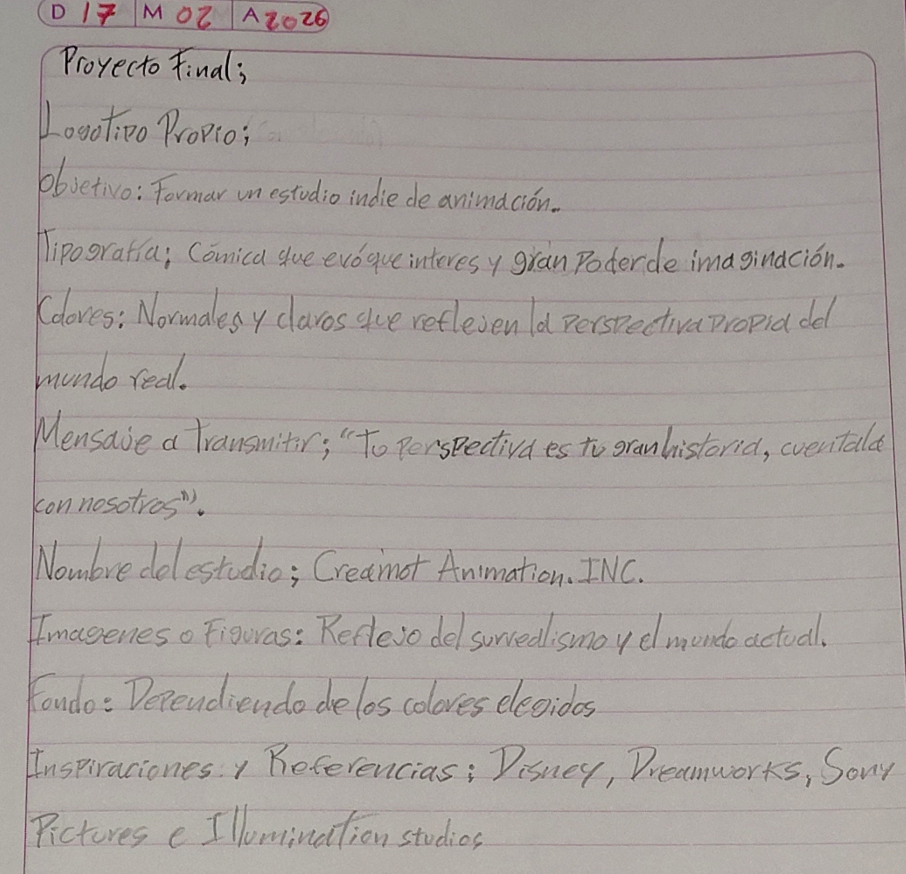 Esta es mi creación, un logotipo propio para formar pronto mi equipo o mi propio estudio de animación indie después de estudiar en Taller Cinco, tiene el nombre de CreaMot INC Animation, yo mismo inventé ese nombre uniendo las palabras de "creative" y "motion". Mi propósito con este proyecto es entrar en el mundo de la animación indie, ser parte de la industria del cine.