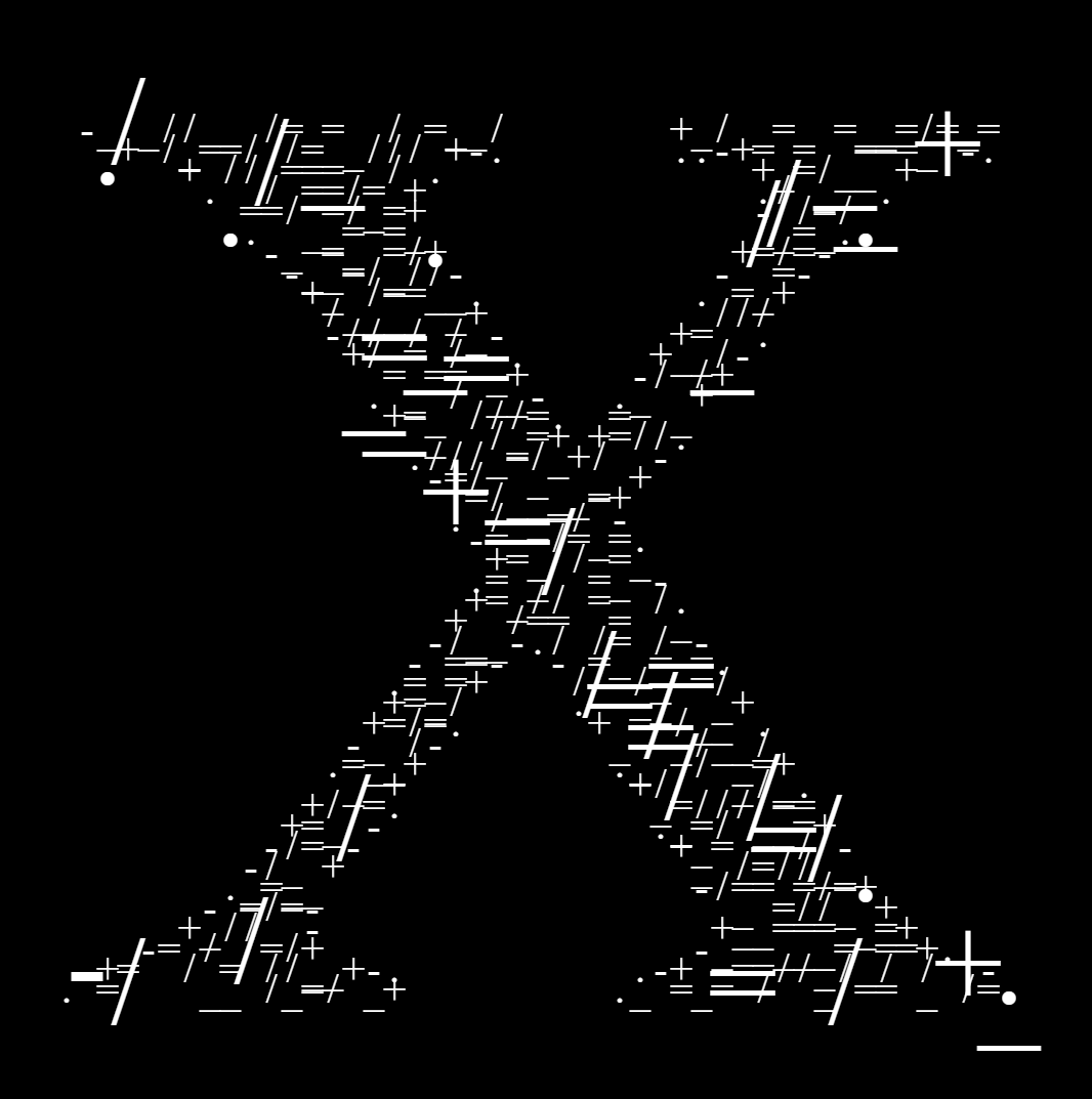 Using canvas-sketch and pixel data manipulation, the system rasterizes text inputs to map brightness levels onto a dynamic composition of symbols like _, /, and +.