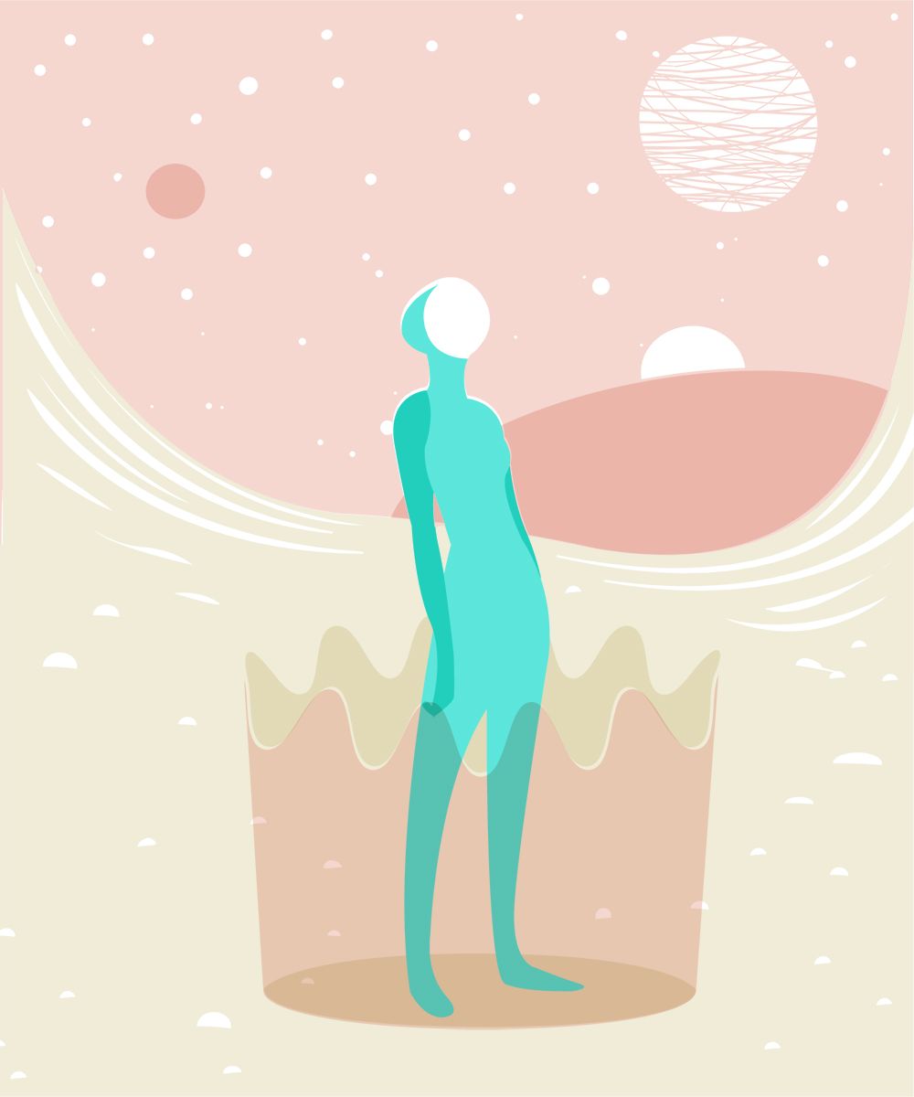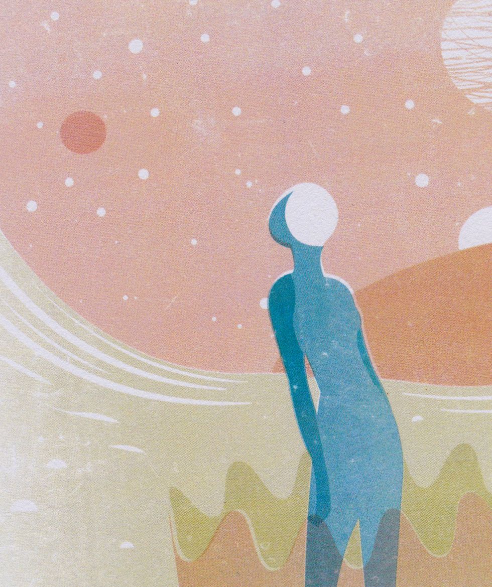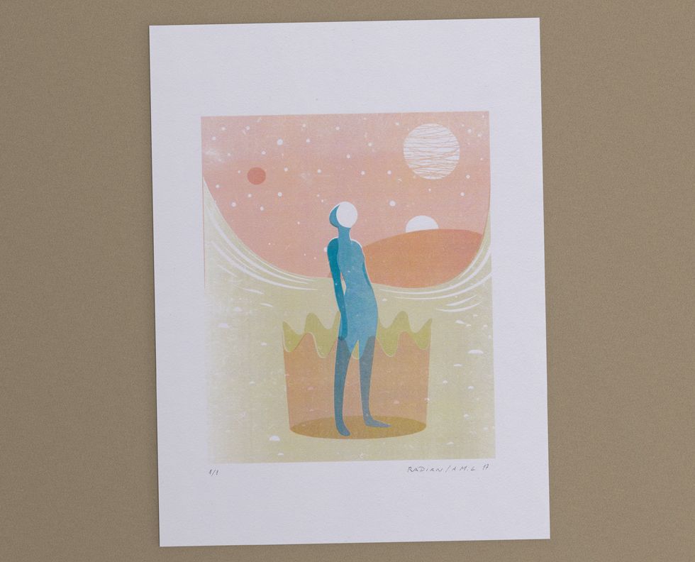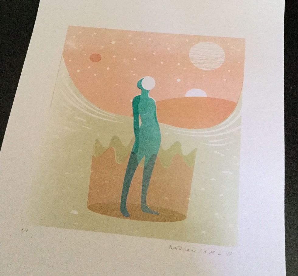 La ilustración es la interpretación del tema "Radian" del dúo Air, donde en una primera fase mística de sonidos ondulantes y envolventes, nos transporta a un universo donde la belleza y la elegancia, entra en comunión con paisajes inhóspitos y solitarios.