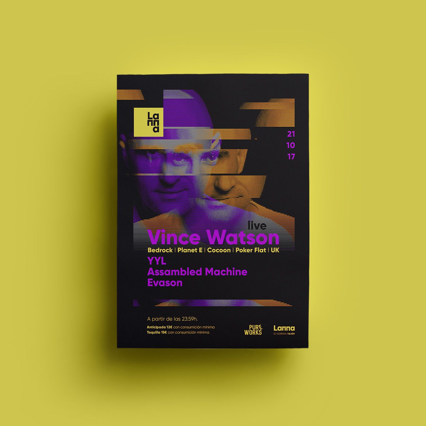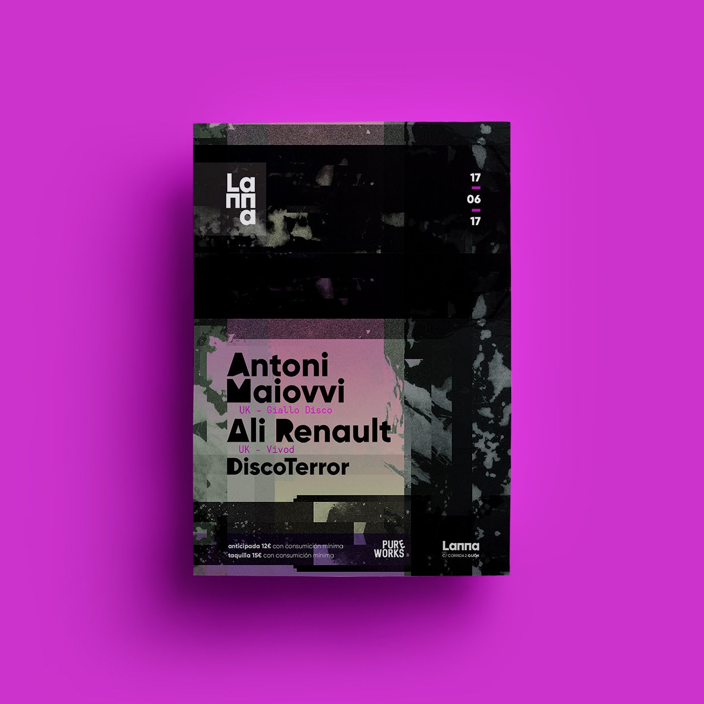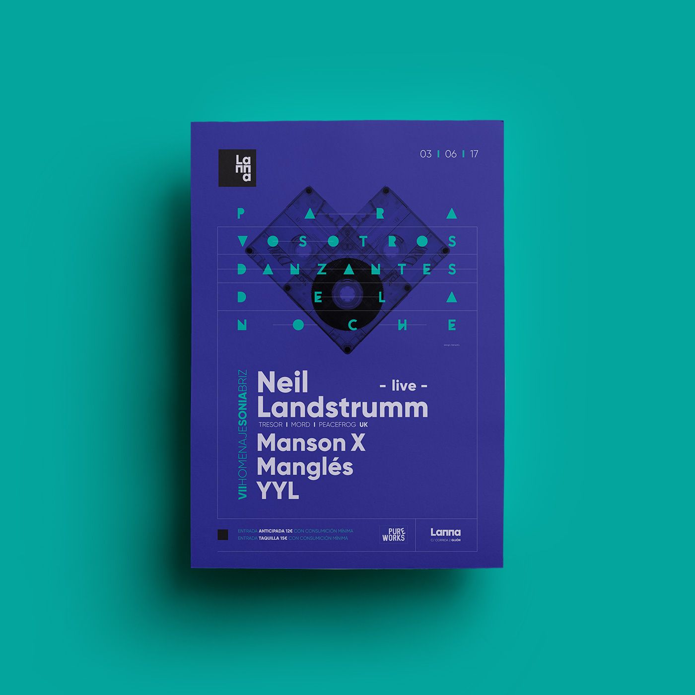 Flyers designed during 2017 for the events of the promoter Pure Works at Lanna Club (Gijón).
