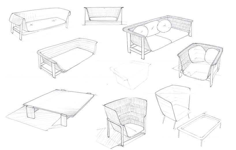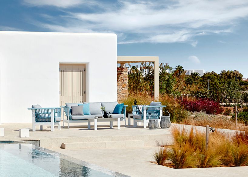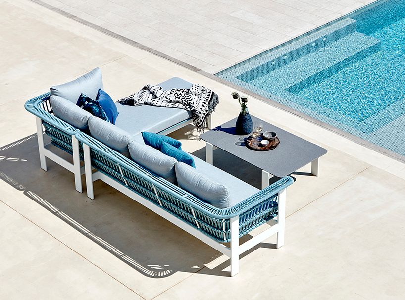 La estructura está realizada en aluminio lacado, que sirve de apoyo para otra estructura cubierta de cuerda, como si de un nido se tratase, transmite seguridad y permite la ventilación del interior, ideal para lugares calurosos. Los respaldos y asientos se completan con unos cojines tapizados en tejido especial de exterior, que aporta calidez respecto a otro tipo de tejidos de exterior.