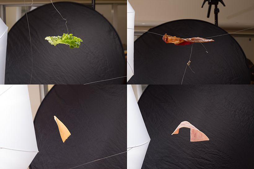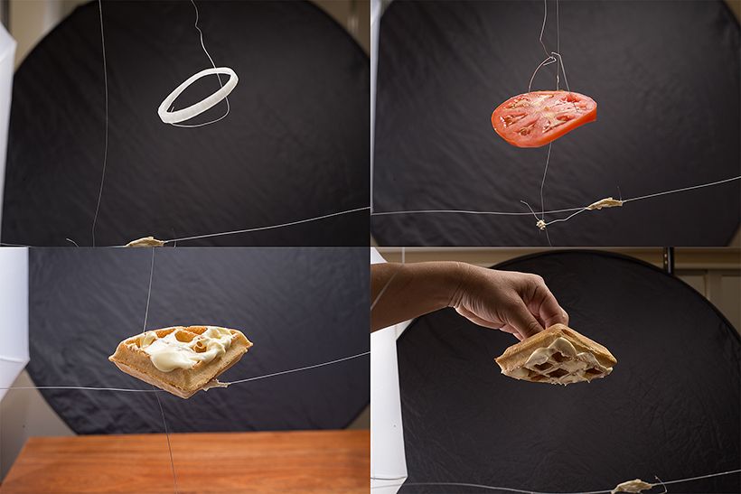 Ha sido uno de los proyectos más divertidos que he hecho, sobre todo por que en la producción fue difícil hacer que los elementos estuvieran flotando, así que utilicé un poco de alambre de estaño que cargo en mi mochila de producción y con la ayuda del cocinero logramos mantenerlos en su lugar. Lo más divertido fue el jamón, tenía que lanzarlo al aire para poder fotografiarlo y que tuviera una forma uniforme ya que al colgarlo del alambre de estaño, fue bastante difícil que se mantuviera recto.
