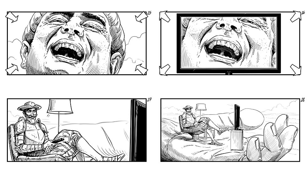 ESP - Storyboards realizados para la película "El hombre Que Mató a Don Quijote", dirigida por Terry Gilliam. Producida por Alacran Pictures, Tornasol Films, Carisco Producciones, (...). (España - 2018).