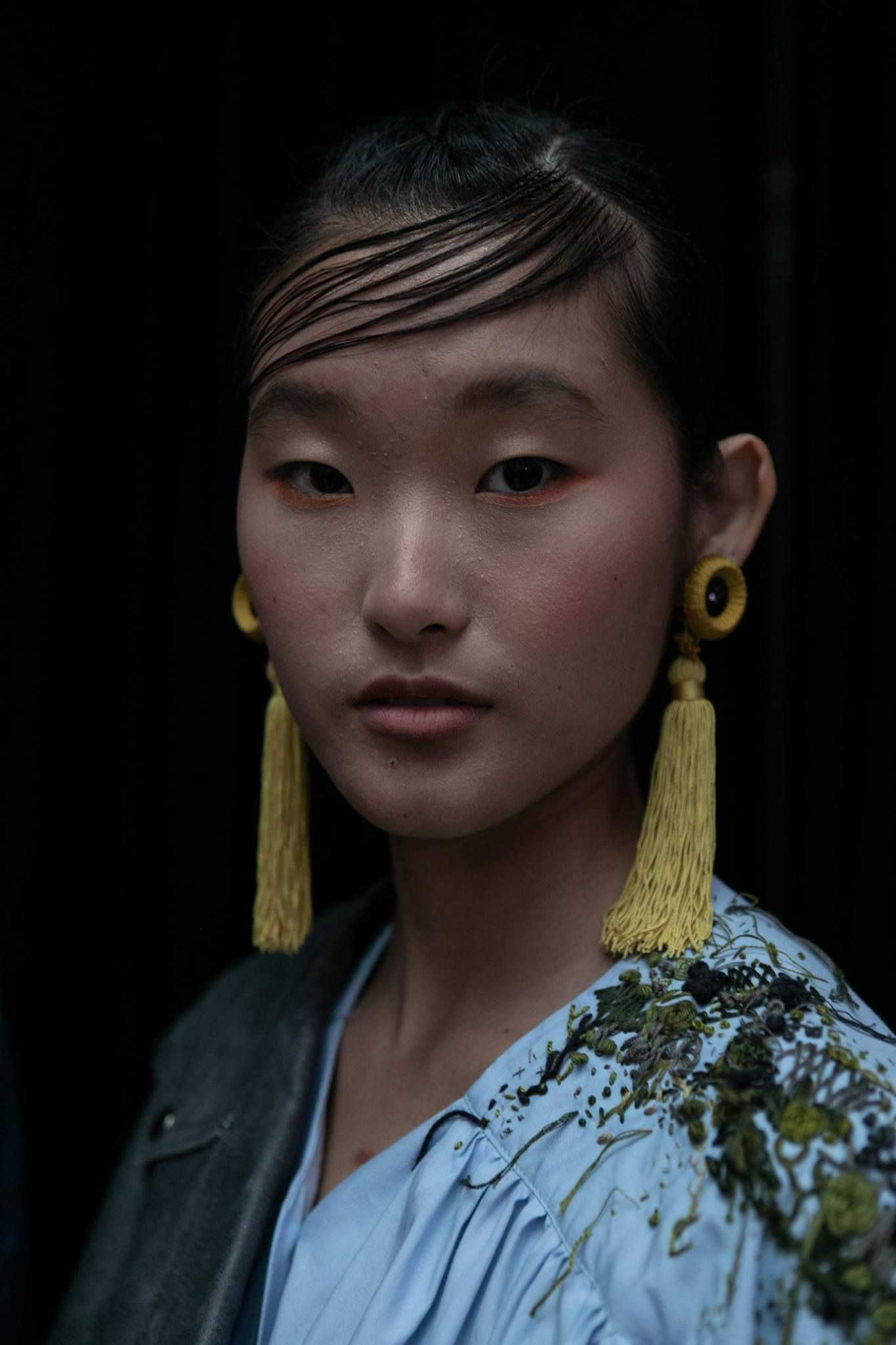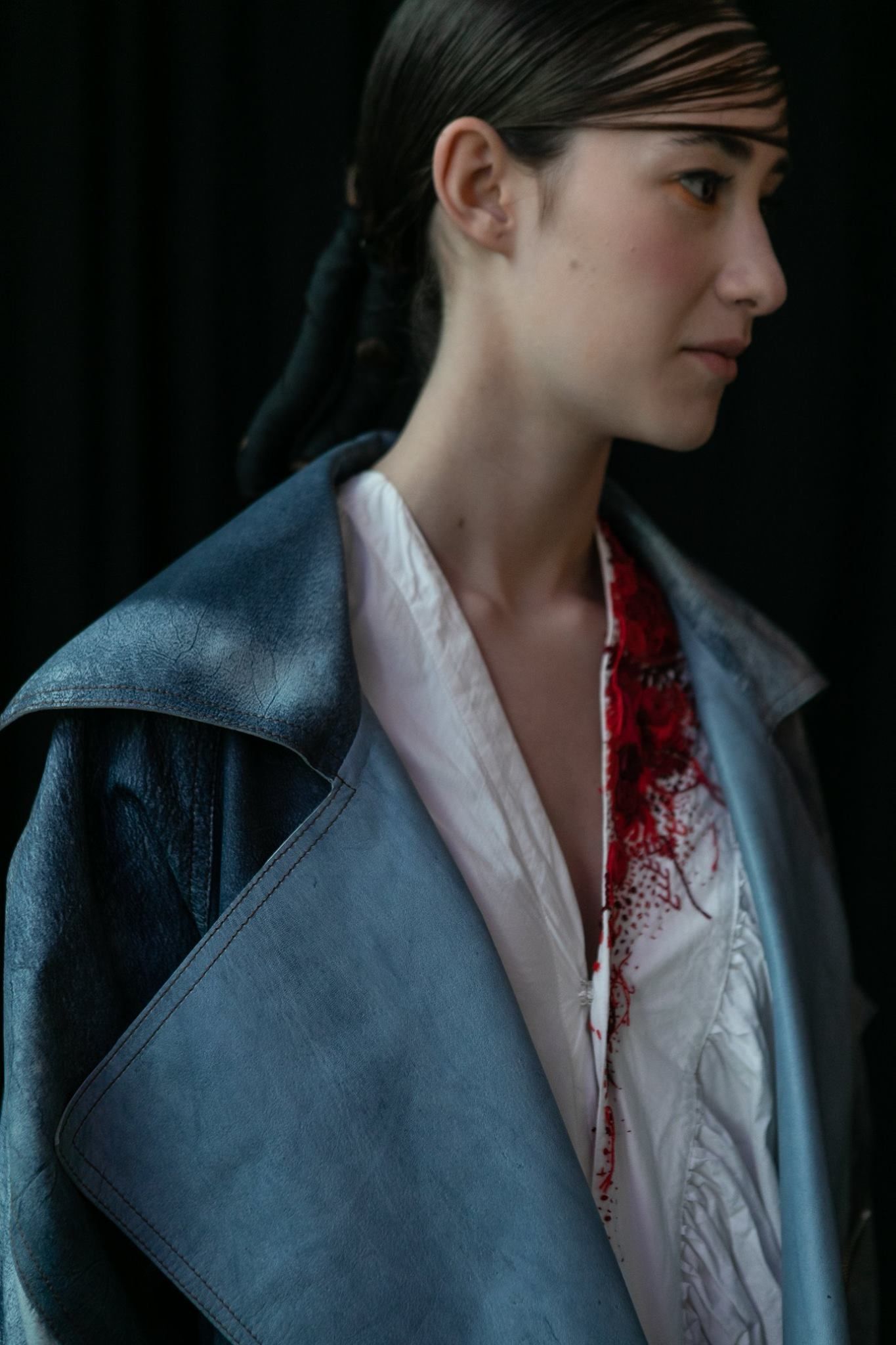 Tejidos tradicionales de fibras naturales como el algodón o el lino se embellecen con estampados hechos a mano o con manipulaciones digitales de motivos florales. Bordados delicados y de hilos sueltos en colores rojo brillante o tonos de verde militar evocan su espíritu romántico y revolucionario.
