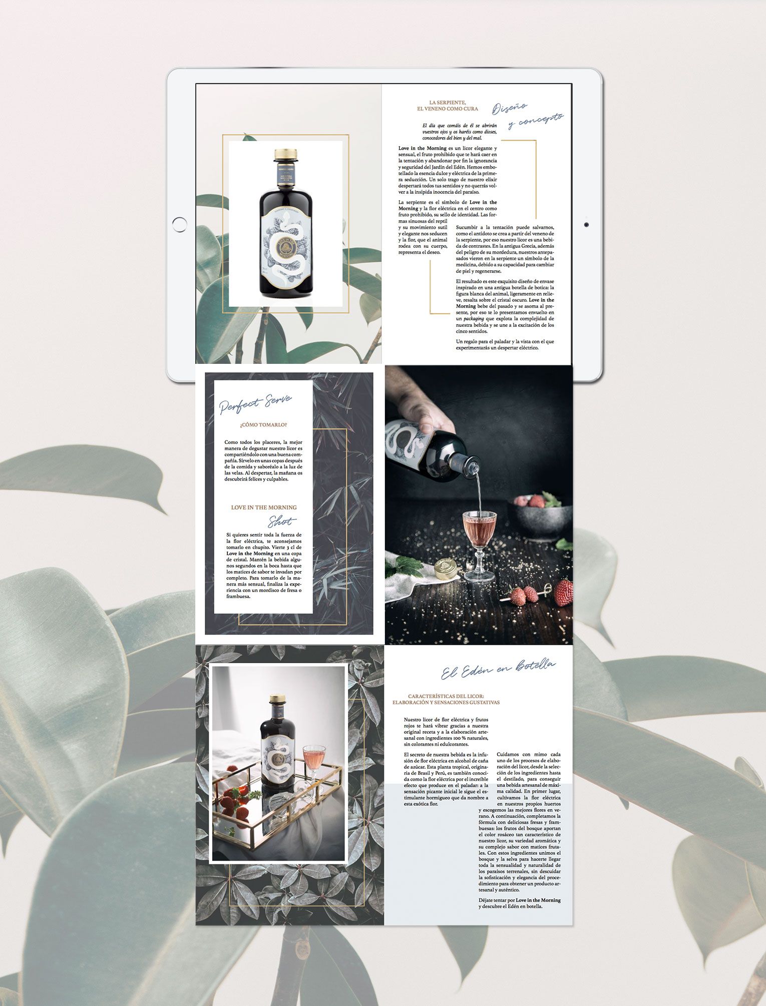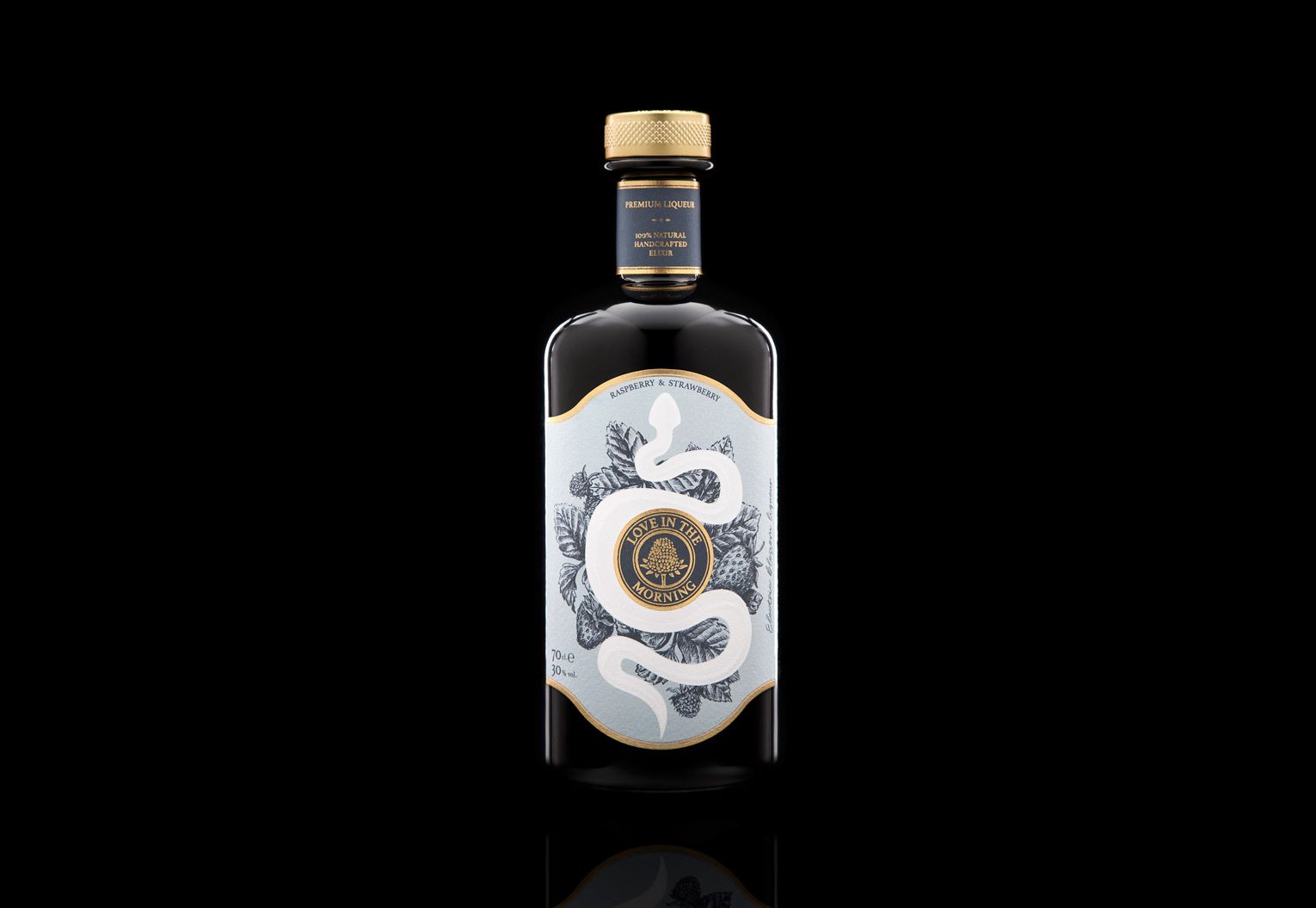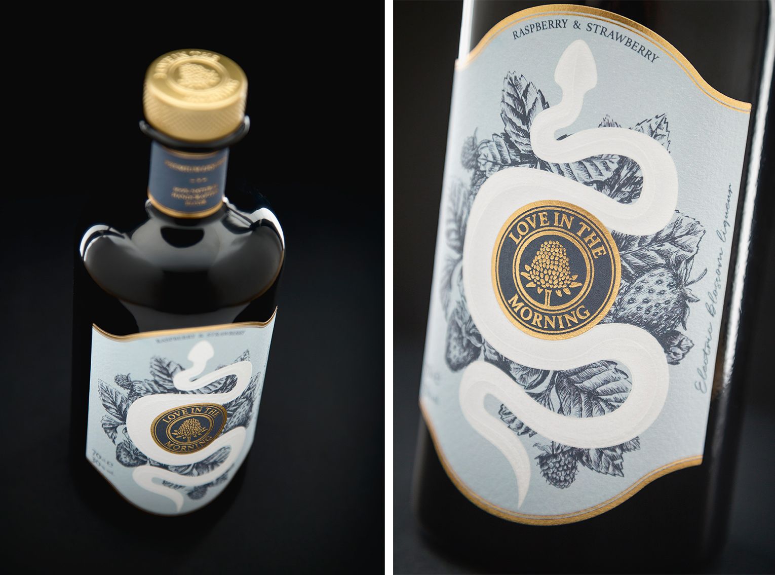 “Love in the Morning” is a handmade production liqueur made with raspberry, strawberry and "electric blossom", a flower that produces a soft tingling sensation in the mouth. The sensuality of the sinuous forms of the snake in composition with the wild elements transports us to Eden, in which the forbidden fruit is the flower itself.