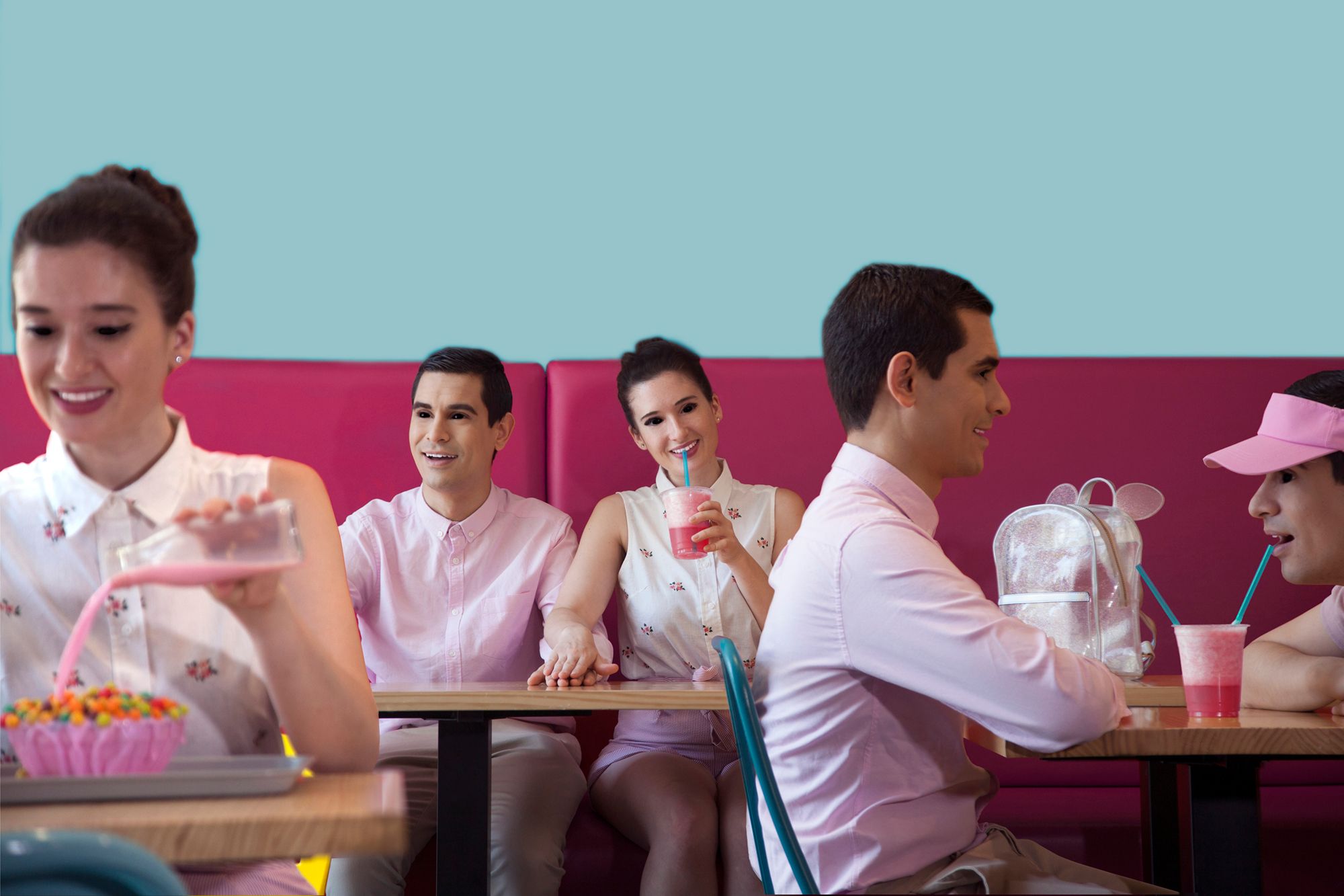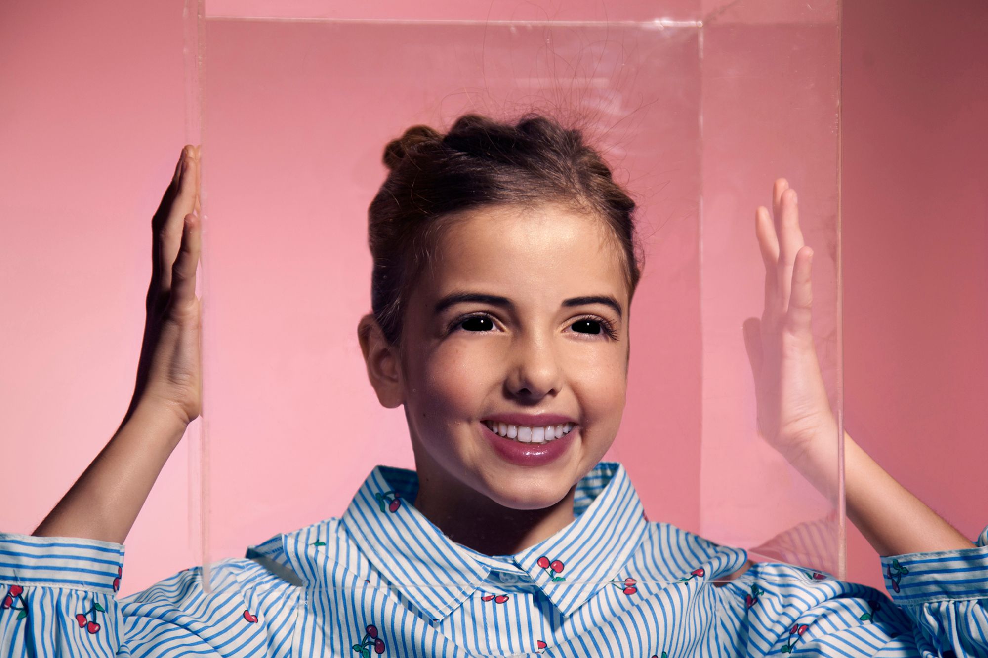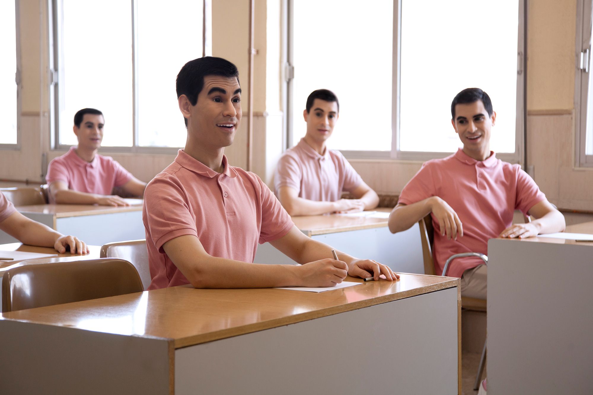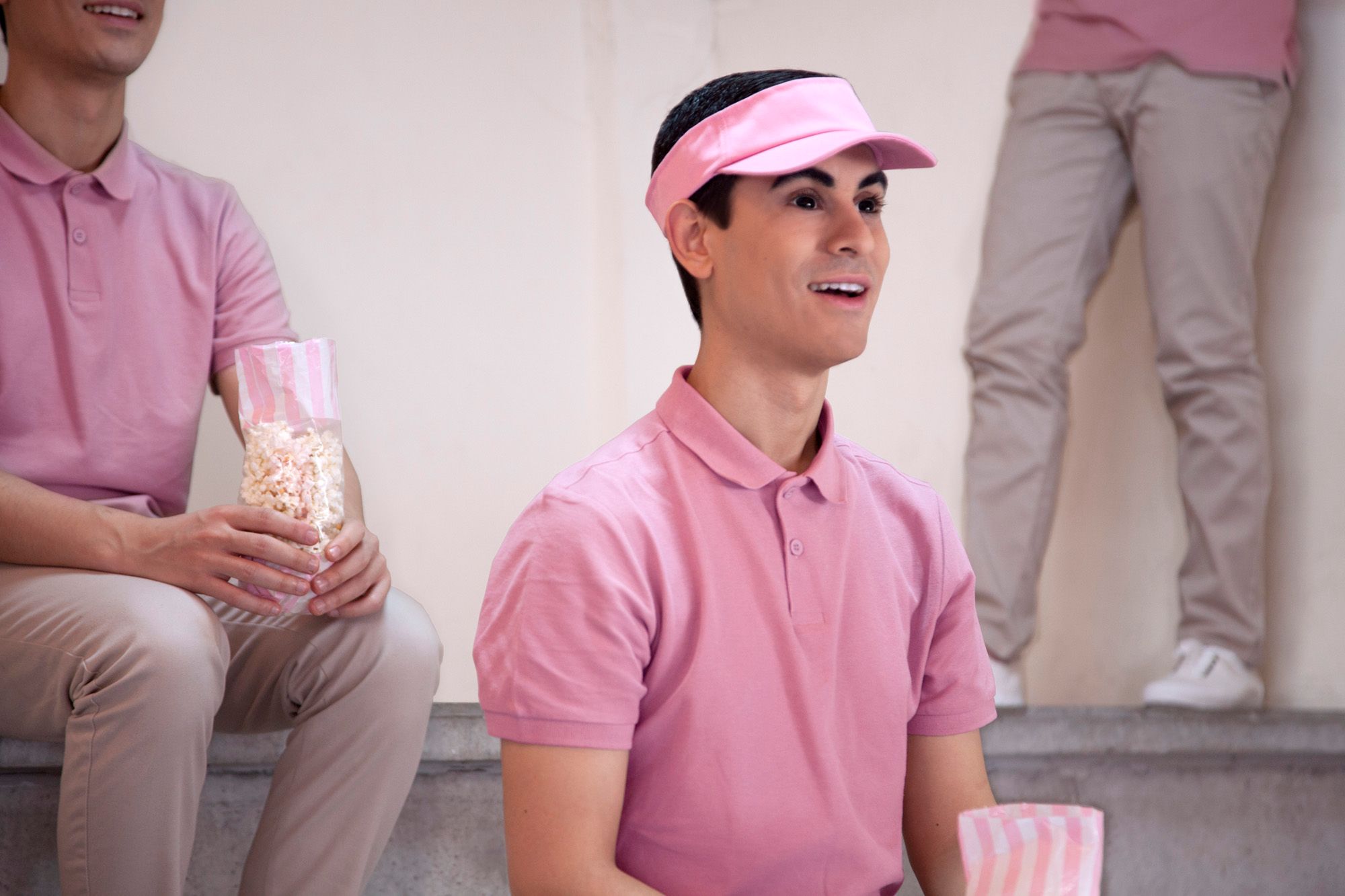 Color is a fundamental element in this work, as is the space, supporting the idea of homogeneity and neutrality, that is, alienation. They also carry a strong symbolic charge. The contrast between pink (a symbol of femininity, tenderness, childhood, and youth) and black (its psychological opposite, represented in the delirious eyes of the subjects) seems to corrupt the naive atmosphere, allowing an uncomfortable and disturbing feeling to develop in the observer.