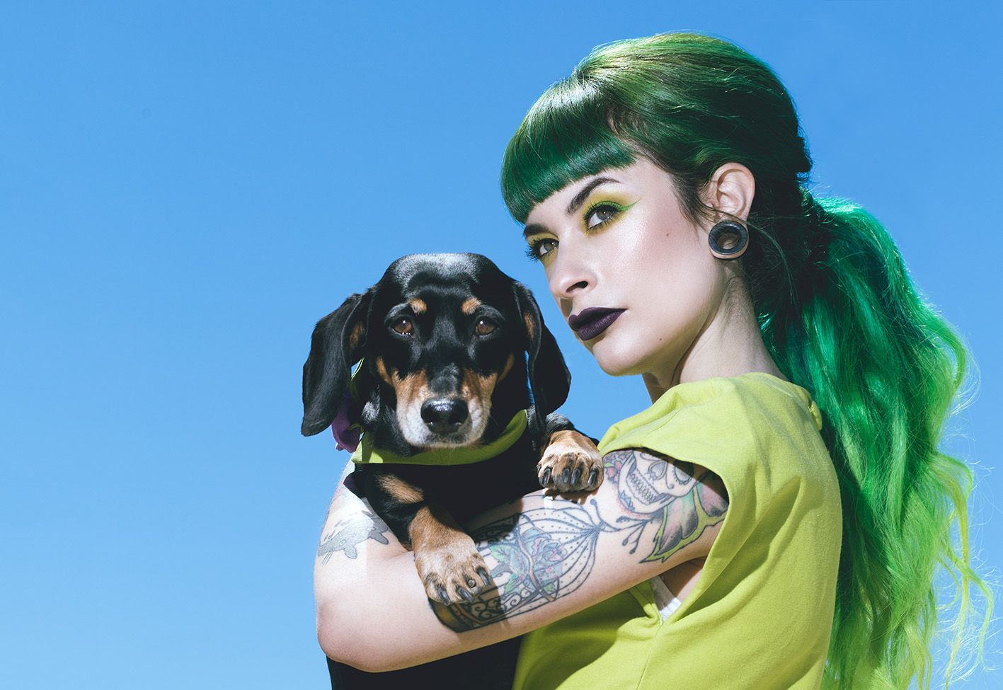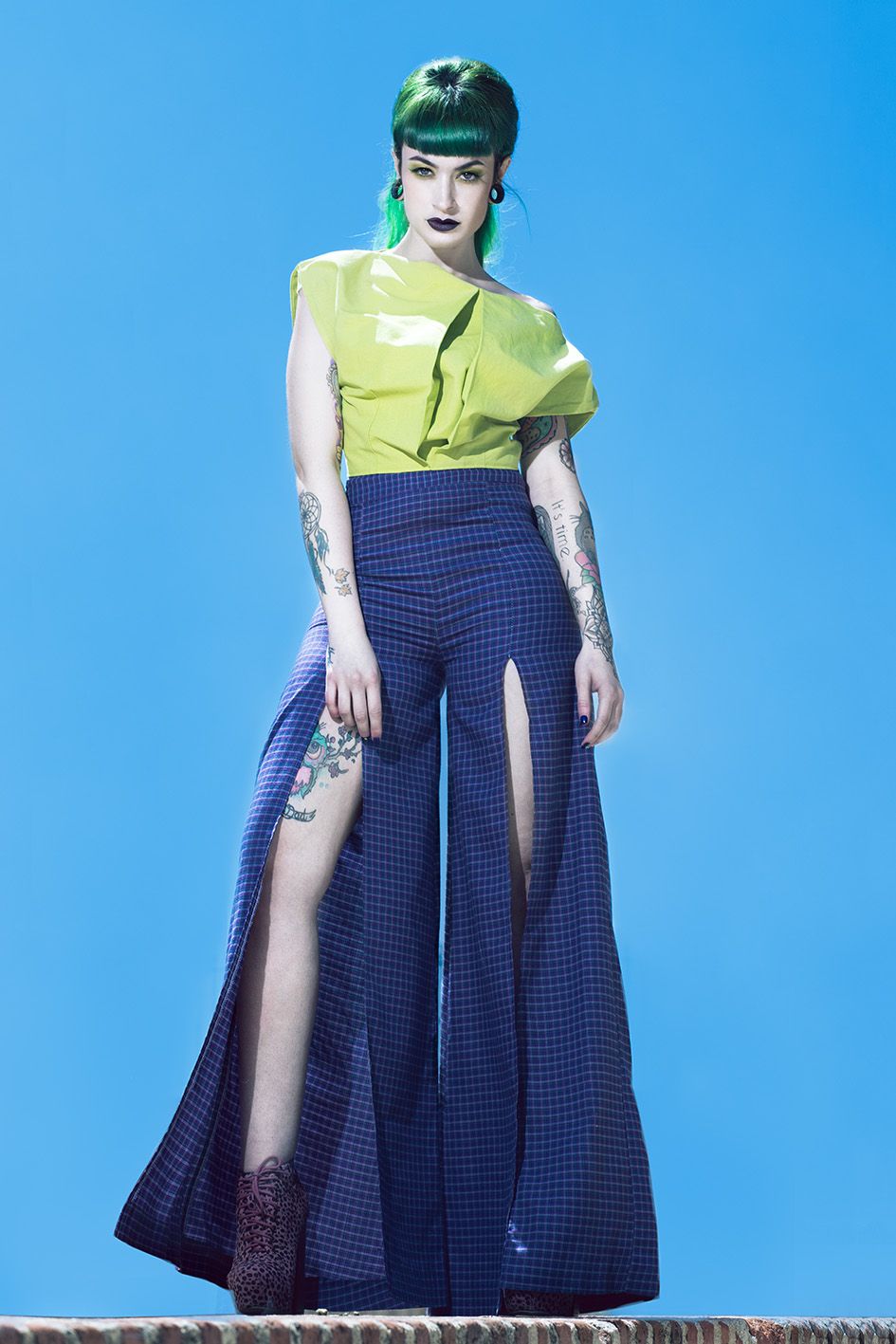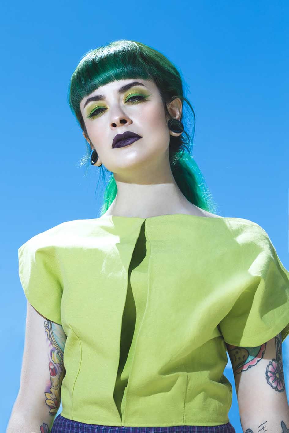 Primero elegí la modelo, como mencioné antes, Maria Lawliet me encajaba a la perfección con su cabello largo y verde, después contacte con Jara Morales (@jara.morales), una diseñadora que suele apostar por colores muy vivos y diseños muy llamativos, aceptó y confeccionó estos diseños a medida para la sesión.