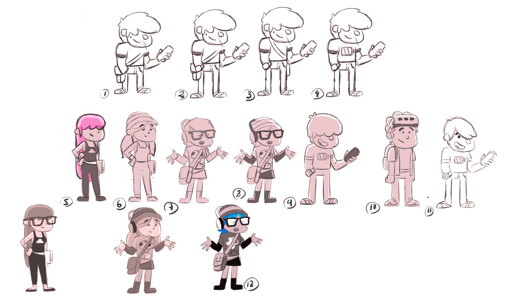El juego es un multijugador colaborativo de construcción de interfaz de usuario, similar a [url=http://spaceteam.ca/]]Spaceteam[/url. Para los personajes, la idea era que fueran de un perfil Nerd, Geek, por lo que trabajé en diferentes opciones, jugando con con diferentes tipos de vestimenta y gadgets. Luego hice algunas pruebas de color Hasta llegar a un resultado final interesante.