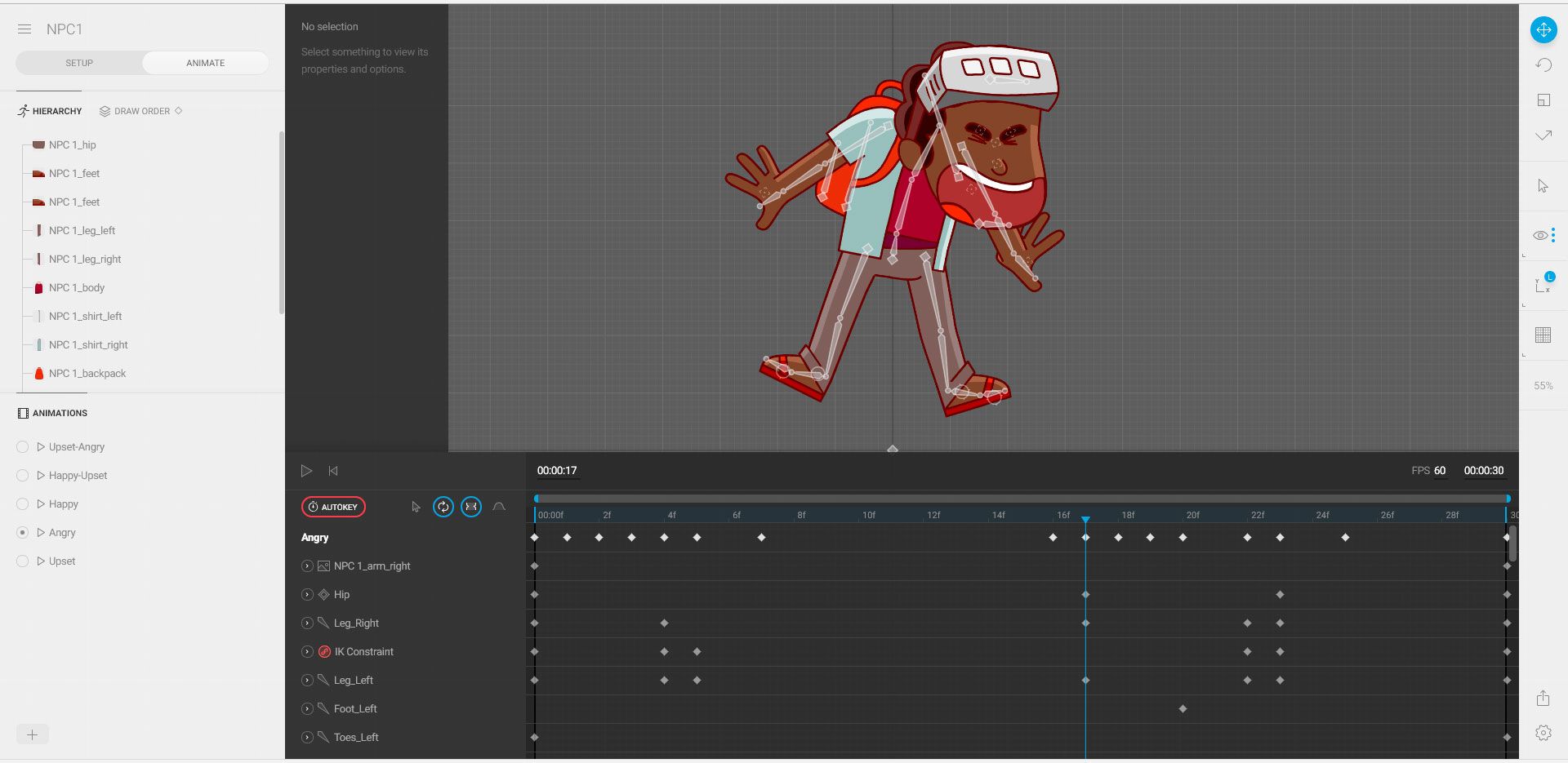 Los personajes están animados con la herramienta de animación Nima, desarrollada por 2Dimensions. Una herramienta online que te permite combinar el uso de huesos, mallas y constraints. En el juego, los personajes pasan por tres estados emocionales (feliz, preocupado y emocionado). Primero hice un pequeño estudio de las animaciones de cada personaje. Luego, según la animación, separé las piezas de cada personajes y añadí algunas nuevas (bocas, ojos y algunas manos). Ya en Nima, con todas las piezas importadas, solo quedaba montar el esqueleto y animar.