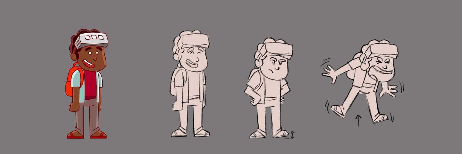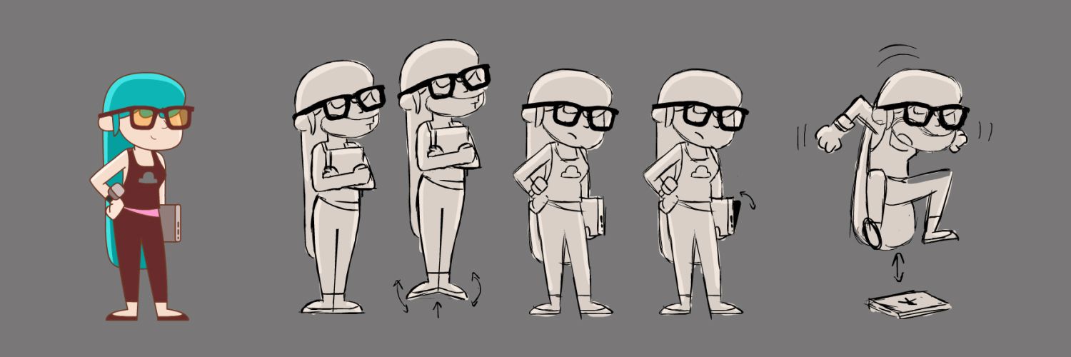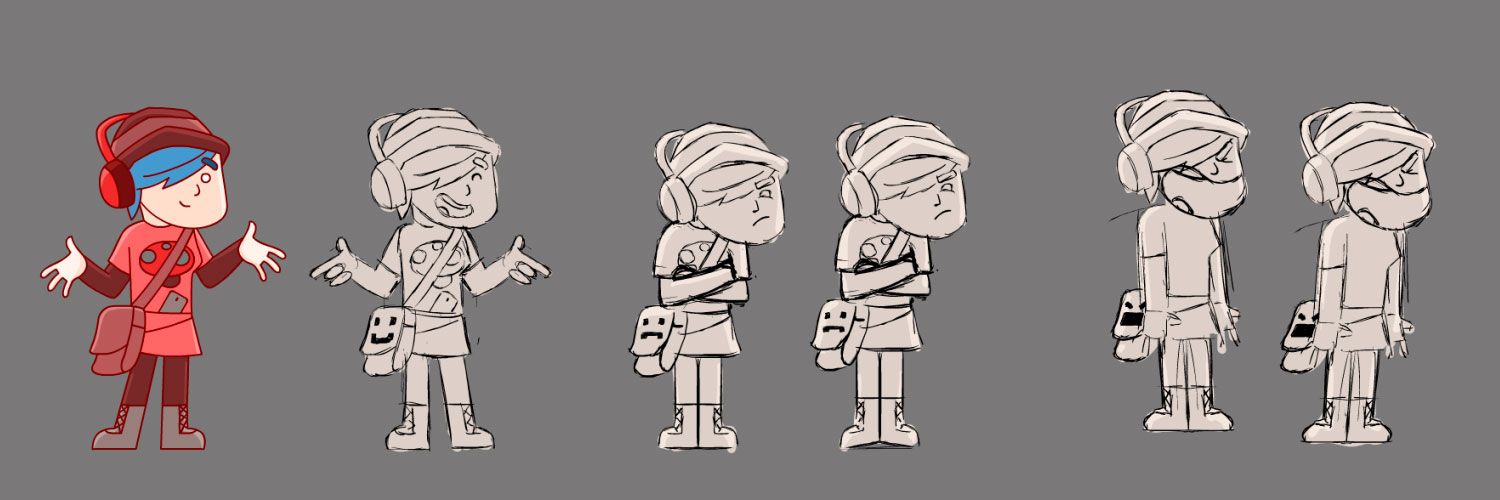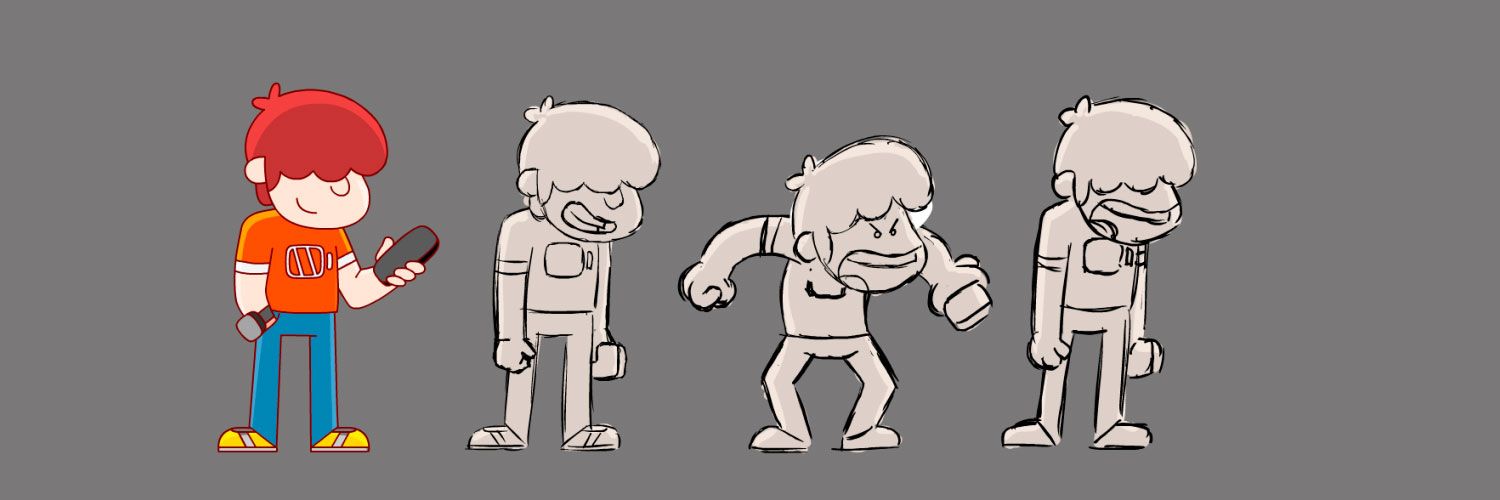 The characters are animated with the animation tool Nima , developed by 2Dimensions. An online tool that allows you to combine the use of bones, meshes, and constraints. In the game, the characters go through three emotional states (happy, worried, and excited). First, I did a small study of each character's animations. Then, based on the animation, I separated the pieces of each character and added some new ones (mouths, eyes, and some hands). Once in Nima, with all the pieces imported, all that was left was to assemble the skeleton and animate.