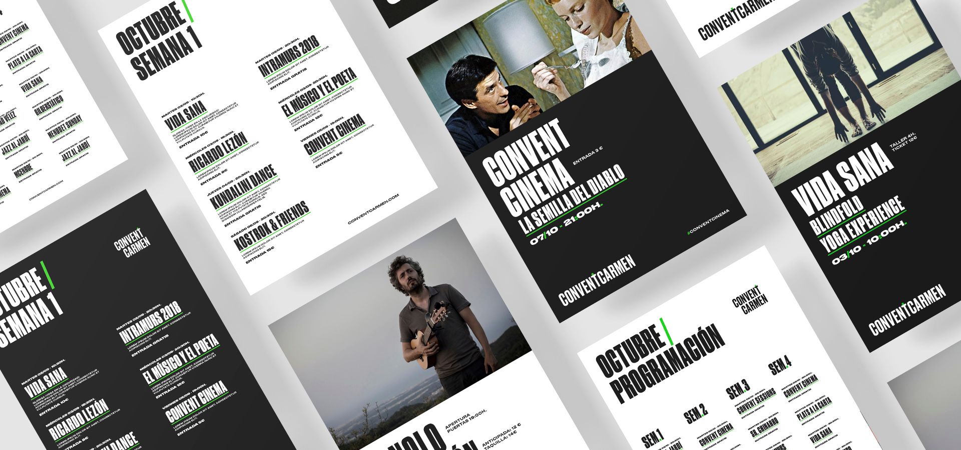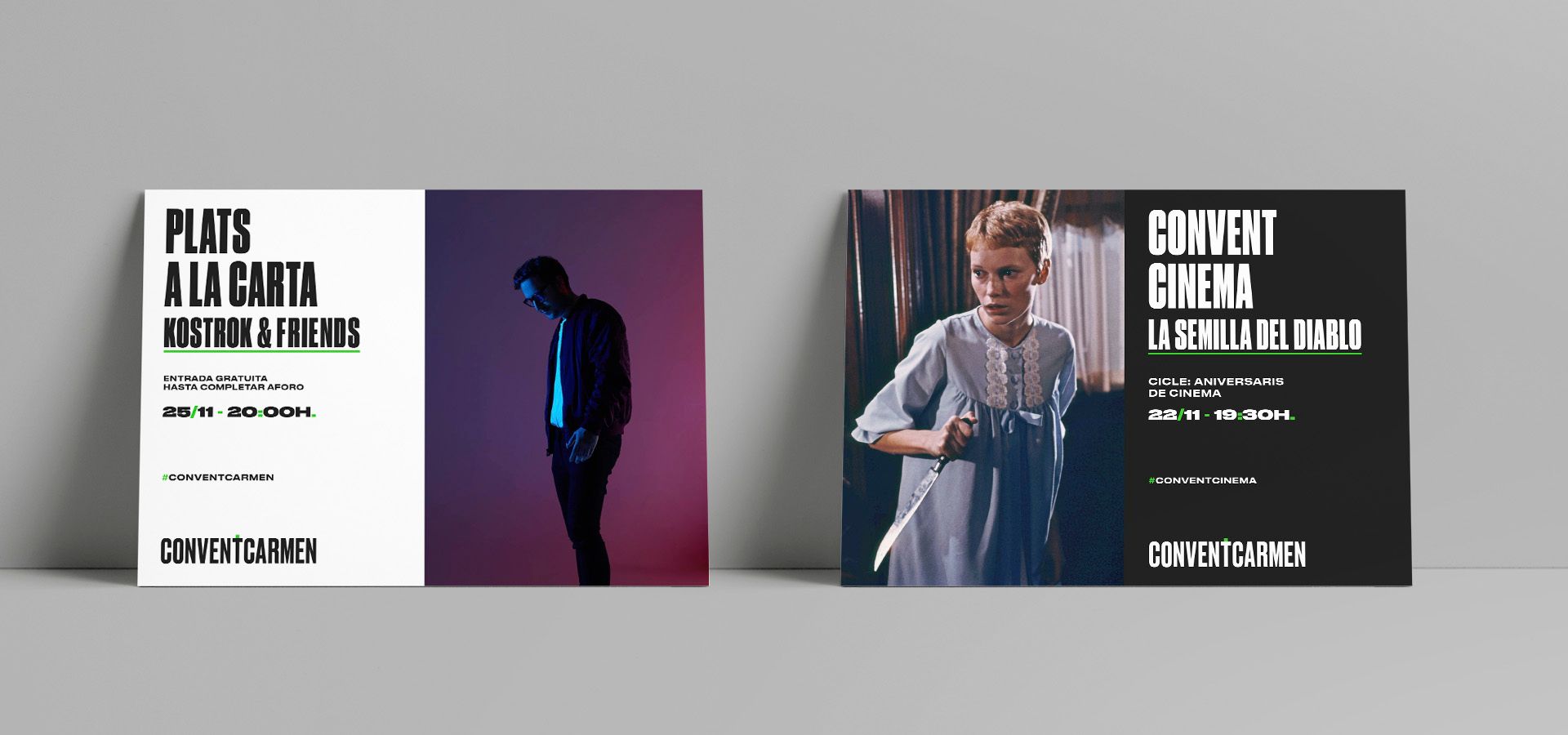We therefore have a visual system dominated by the use of grids, typography, photography, positive and negative, and point color. Color helps us differentiate the different areas where we operate: green for cultural events, red for everything related to the gastronomic offering, blue for the future hotel, etc.