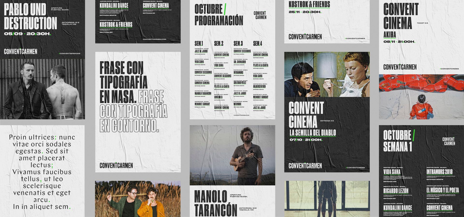 La familia tipográfica escogida para el desarrollo de las marca y de las piezas es la Druk de Commercial Type, palo seco y bold, en varias versiones; condensadas o extendidas. Como tipografía complementaria tenemos la Chap de Schick Toikka una tipografía de carácter clásico pero contemporáneo que nos remite a la reconversión de este espacio religioso abierto ahora a la ciudadanía.