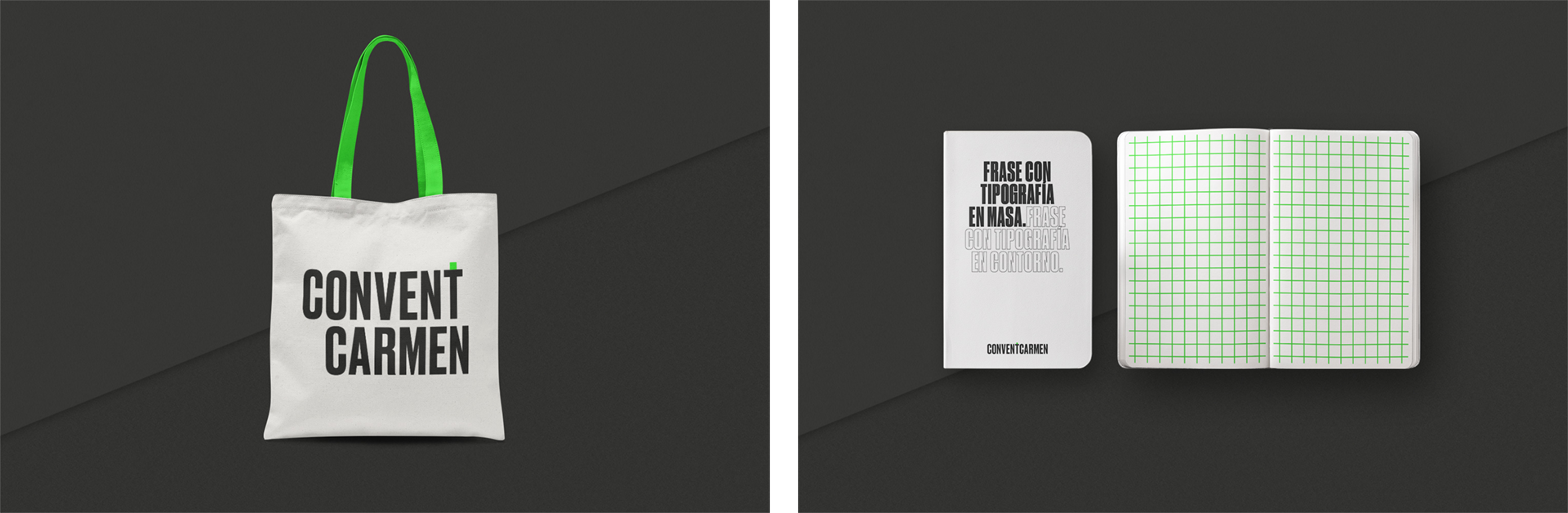 Hemos diseñado un logotipo en blanco y negro, donde la letra T se transforma en una cruz a través de un punto verde neón como símbolo referencial del espacio físico que fue, un convento.