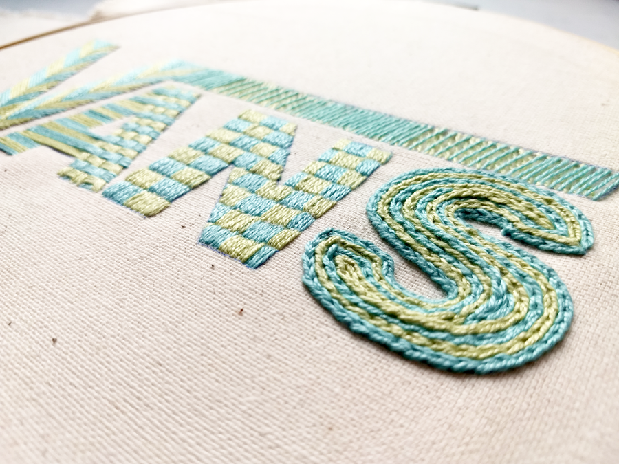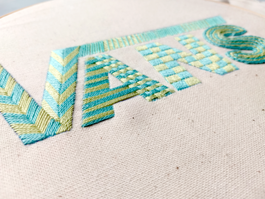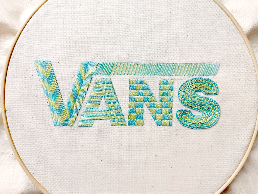 El primer logotipo que intervine por experimentar fue el de Vans. No solo porque es una marca que admiro y que uso, si no porque su composición se prestaba a poder hacer una combinación de puntadas muy interesantes. Usé una paleta de color muy tenue pero brillante y las puntadas están inspiradas en conceptos que la Vans evoca.