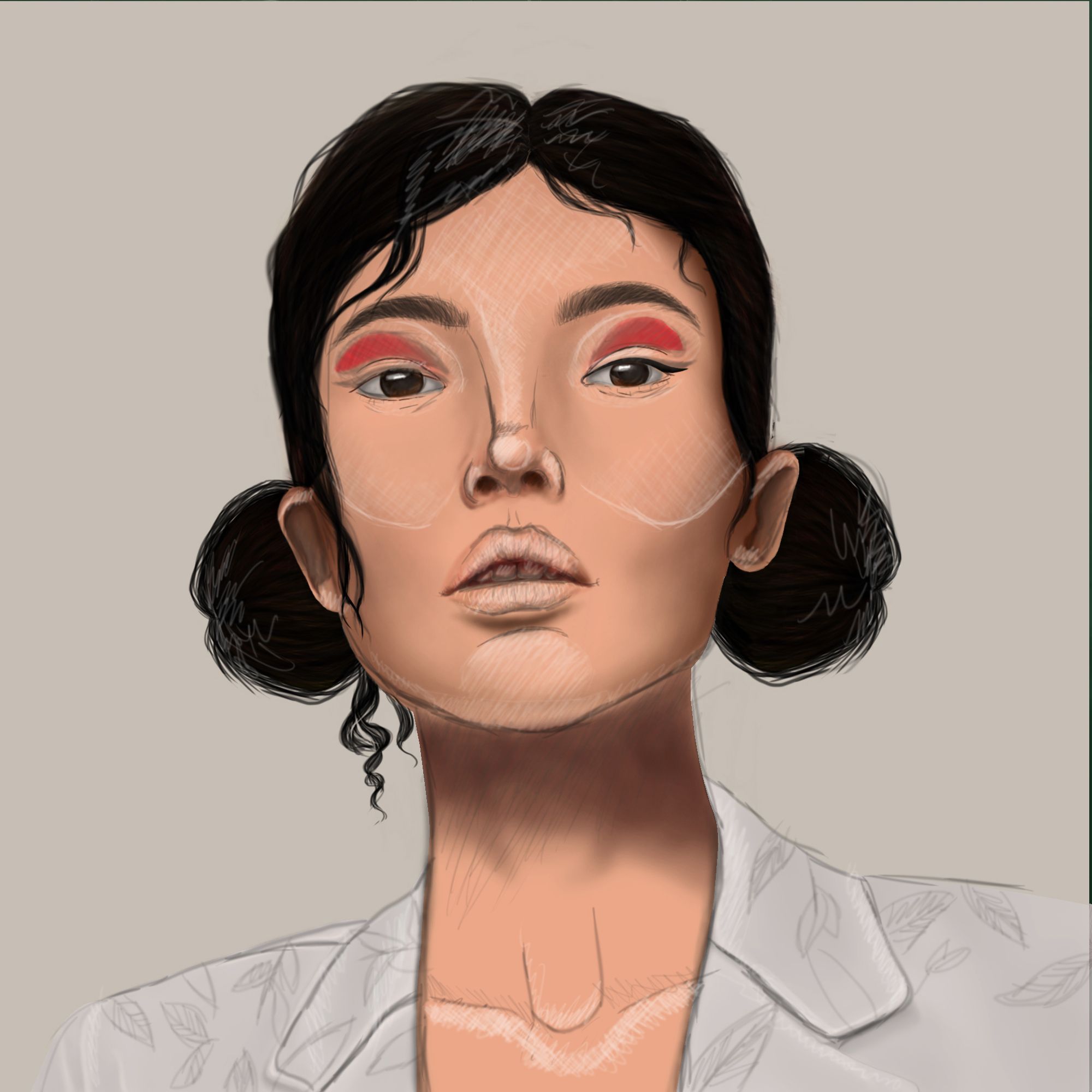 4. Ya tenemos los colores definidos, sombras y luces marcadas. Vemos que es hora de dar detalles, por ejemplo, los labios comienzan a generar una textura de labios reales. Saber jugar con los pinceles o las herramientas que nos proporciona nuestro software nos ahorra mucho trabajo, se pueden crear pinceles que simulen cabello, pecas, incluso la textura de una prenda de vestir.