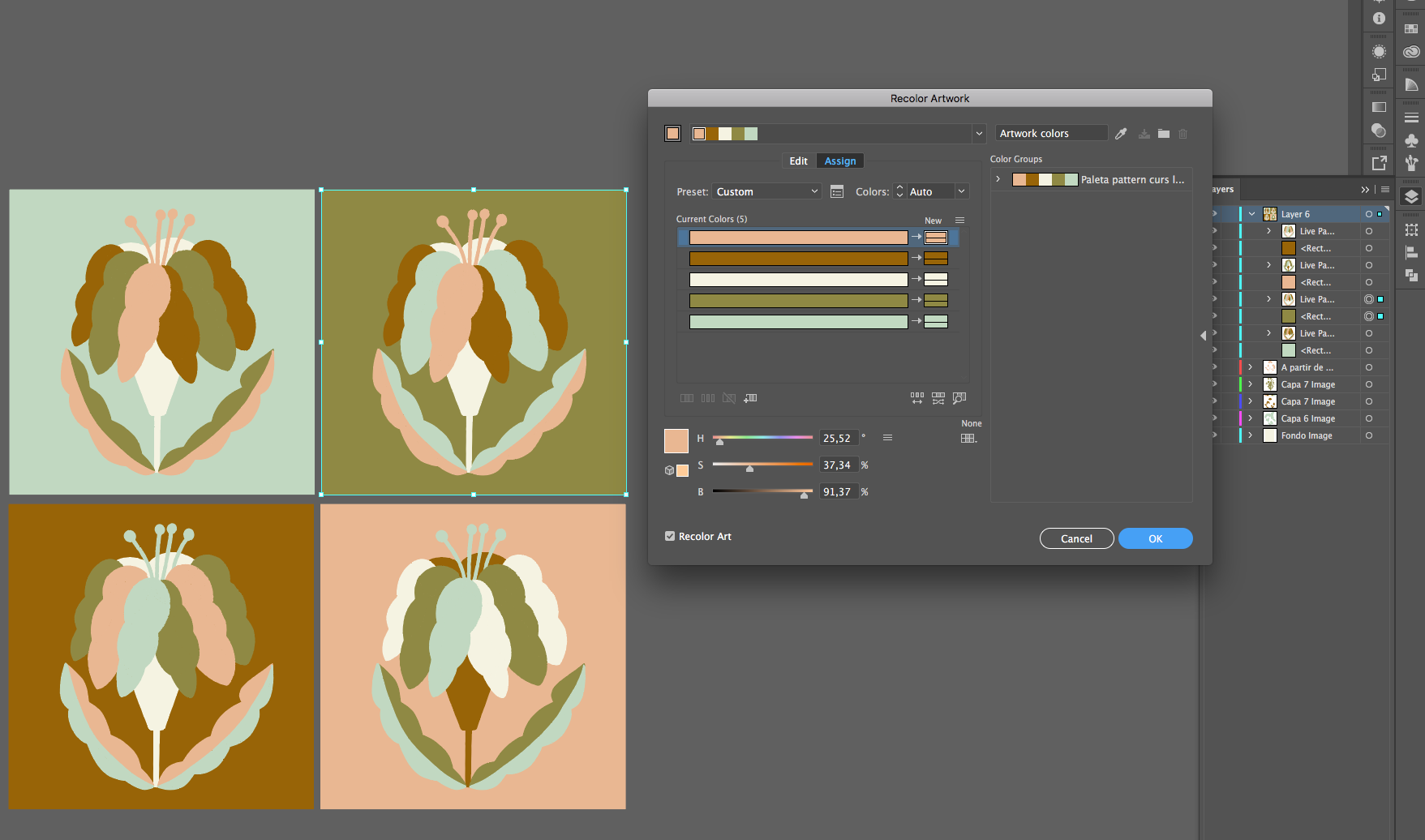 En primer lugar tomé la decisión de qué paleta de color utilizar. A continuación muestro un pedacito del proceso de trabajo.