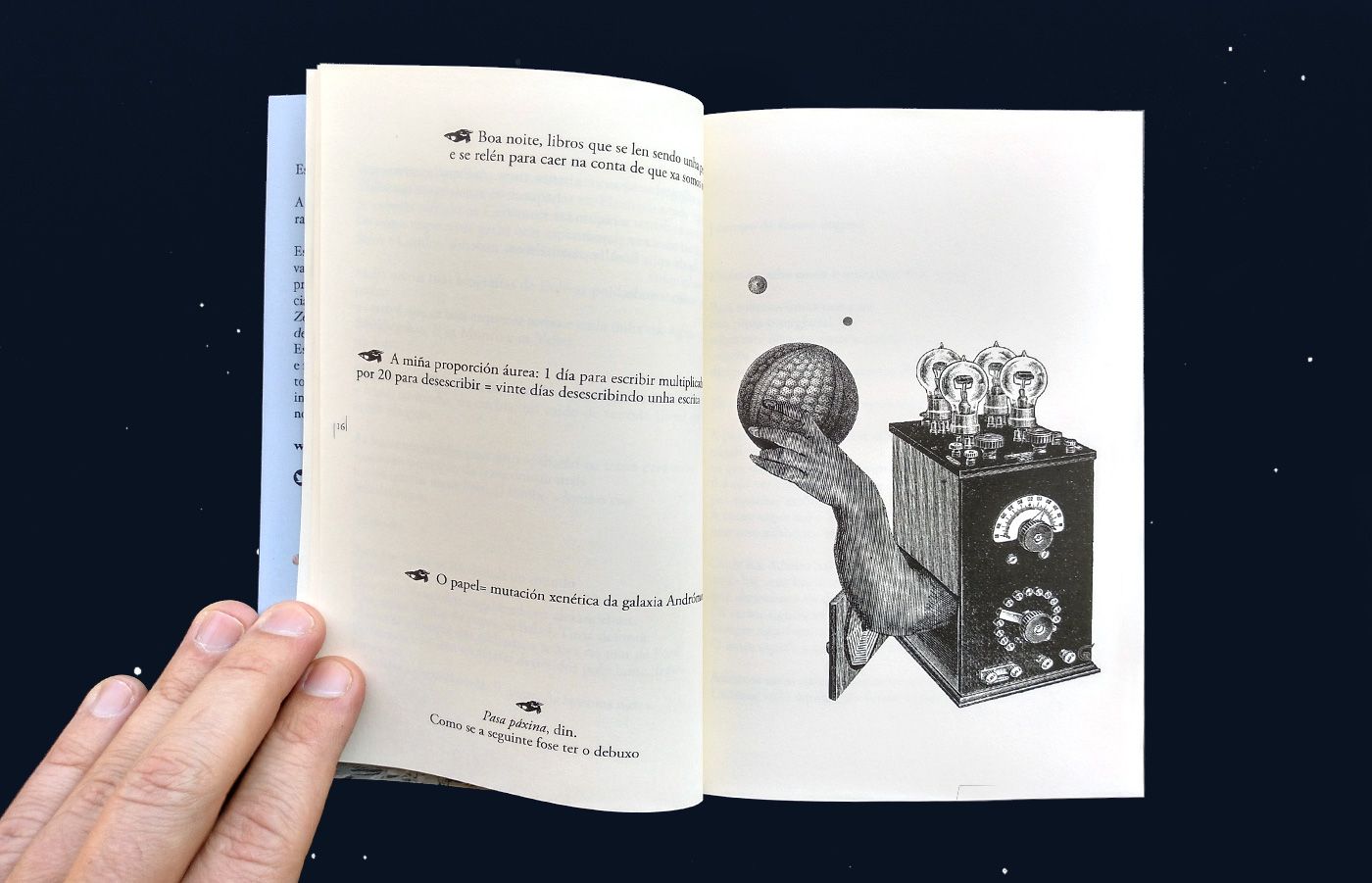 I designed the cover, created the cover image, two more to illustrate the text, and several random illustrations. The cover brings together some of the ideas that populate Estíbaliz's poems: the portrait of a cosmonaut offering a star that is the core of an apple; something vast that is reflected in something small. The cosmonaut's visor shines, and the flash is part of the message that was launched into space on a plaque on the Pioneer 10 spacecraft in 1983.