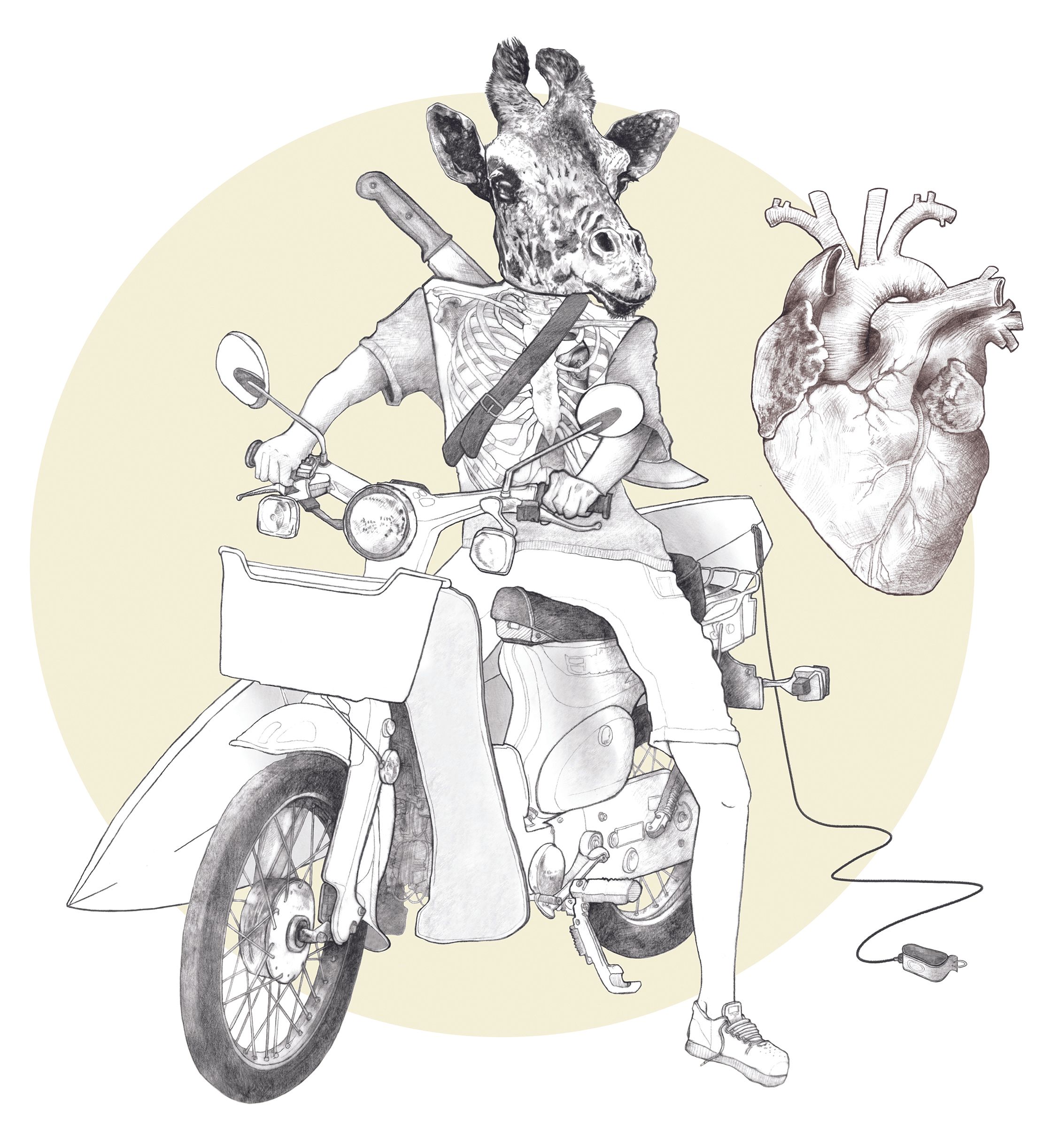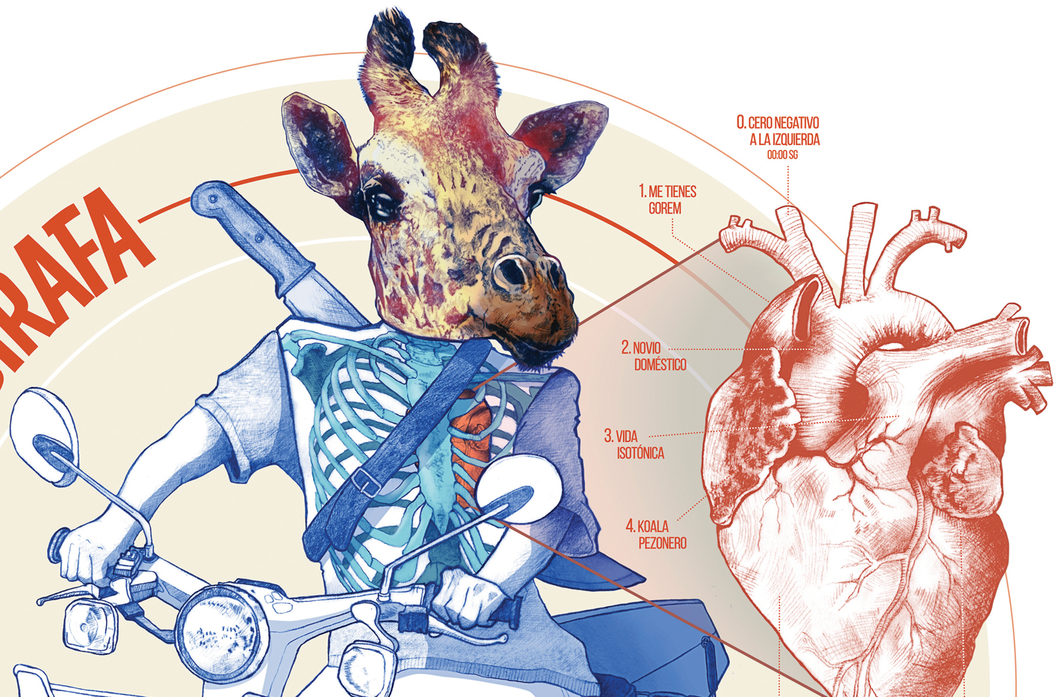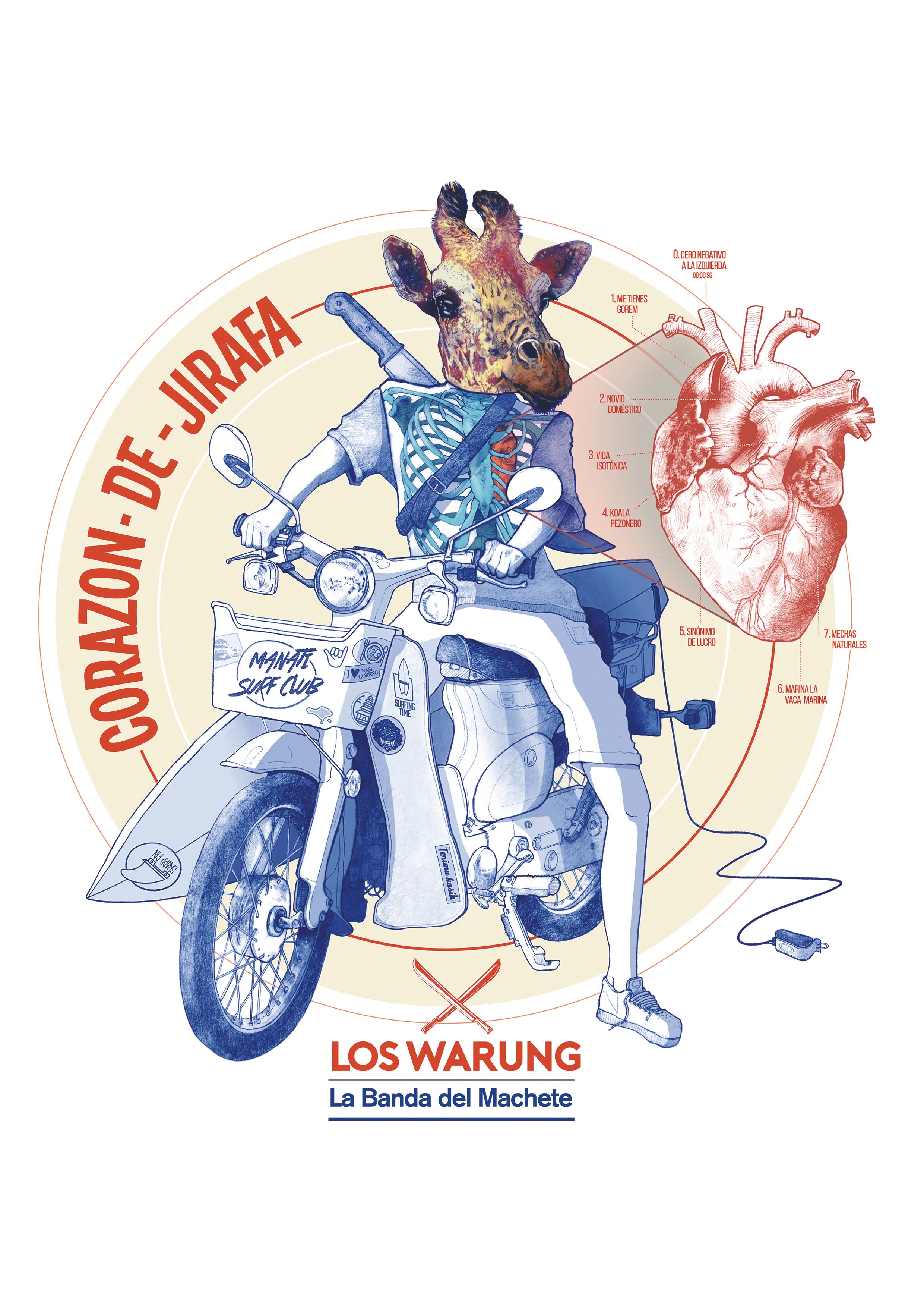 Empieza el Proyecto; en este caso, para el diseño promocional del disco "Corazón de Jirafa"... Momento de coger el lápizUna vez dibujado a lápiz, toca escanearlo y empezar a colocar los elementos digitalmenteEl Proyecto necesitaba un logotipo así que... manos a la obra (Esta vez tiré de illustrator)Juntamos elementos y empezamos a añadir detalles, colores...Más color, detalles y sombras para enfatizar lo deseado... y voiláun poco mas cerca :)