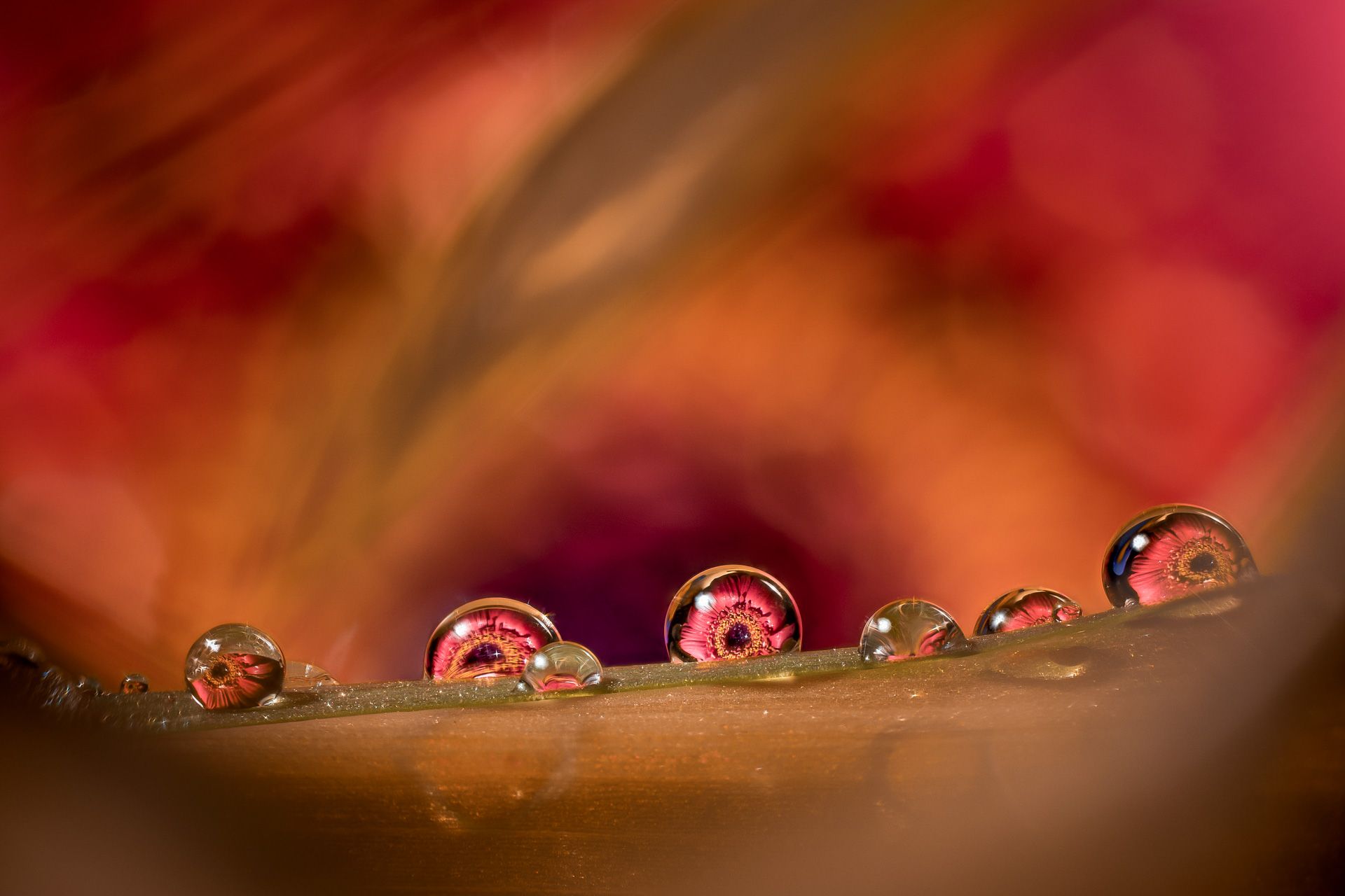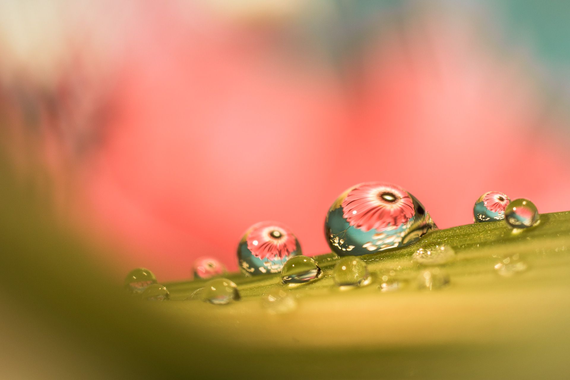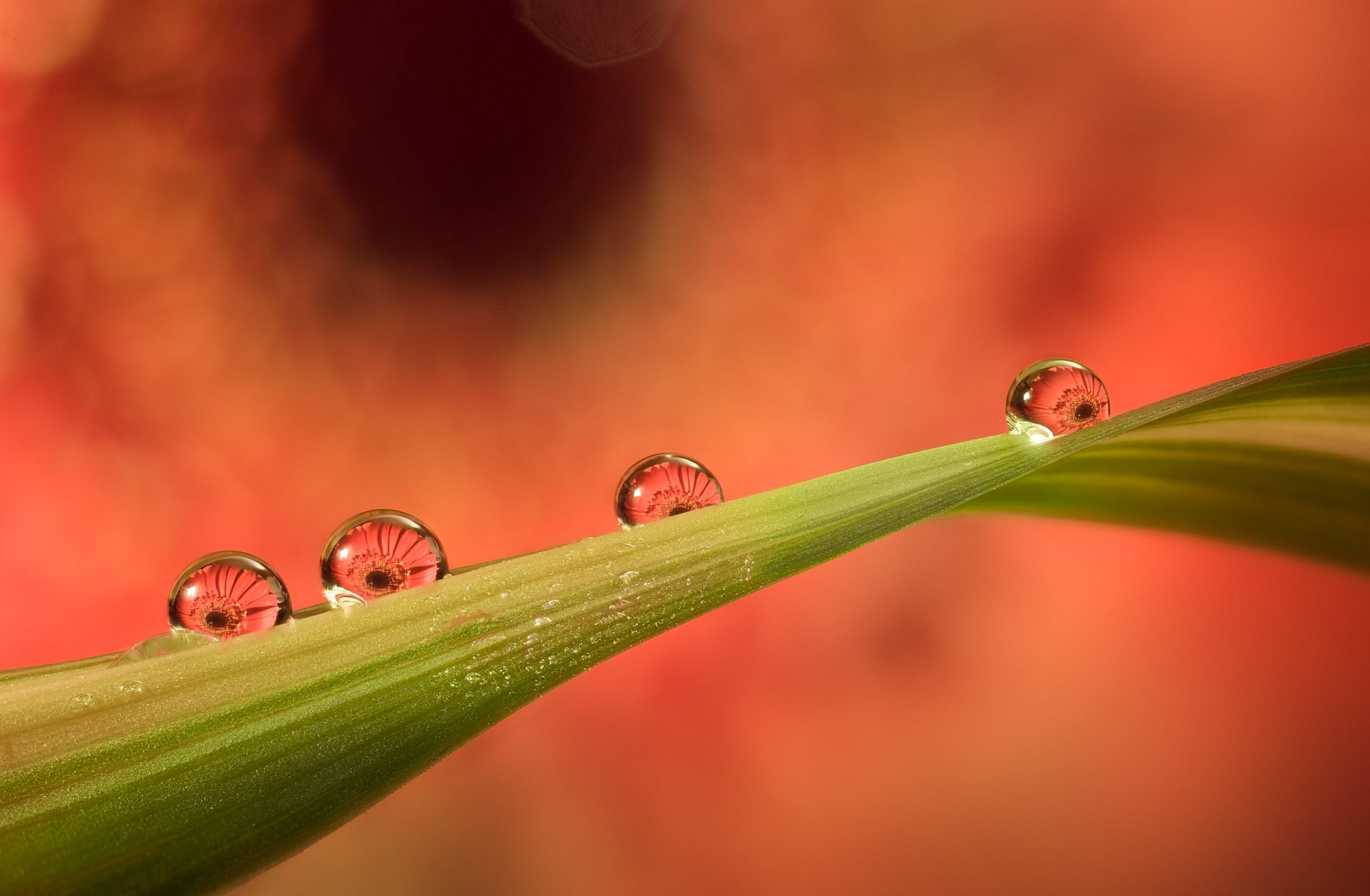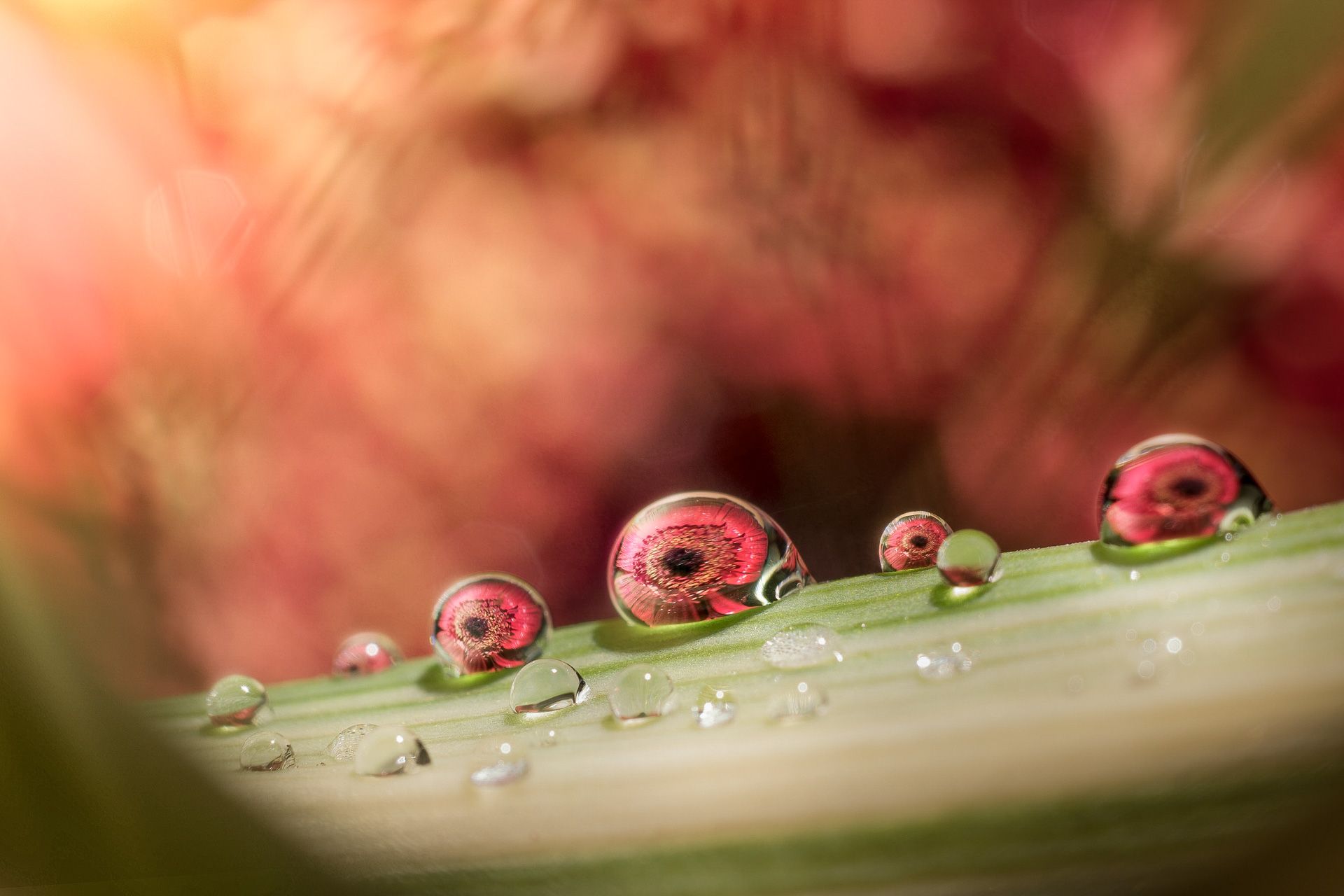- Las gotas están posadas sobre pétalos, césped o plantas tipo cinta (Chlorophytum comosum)