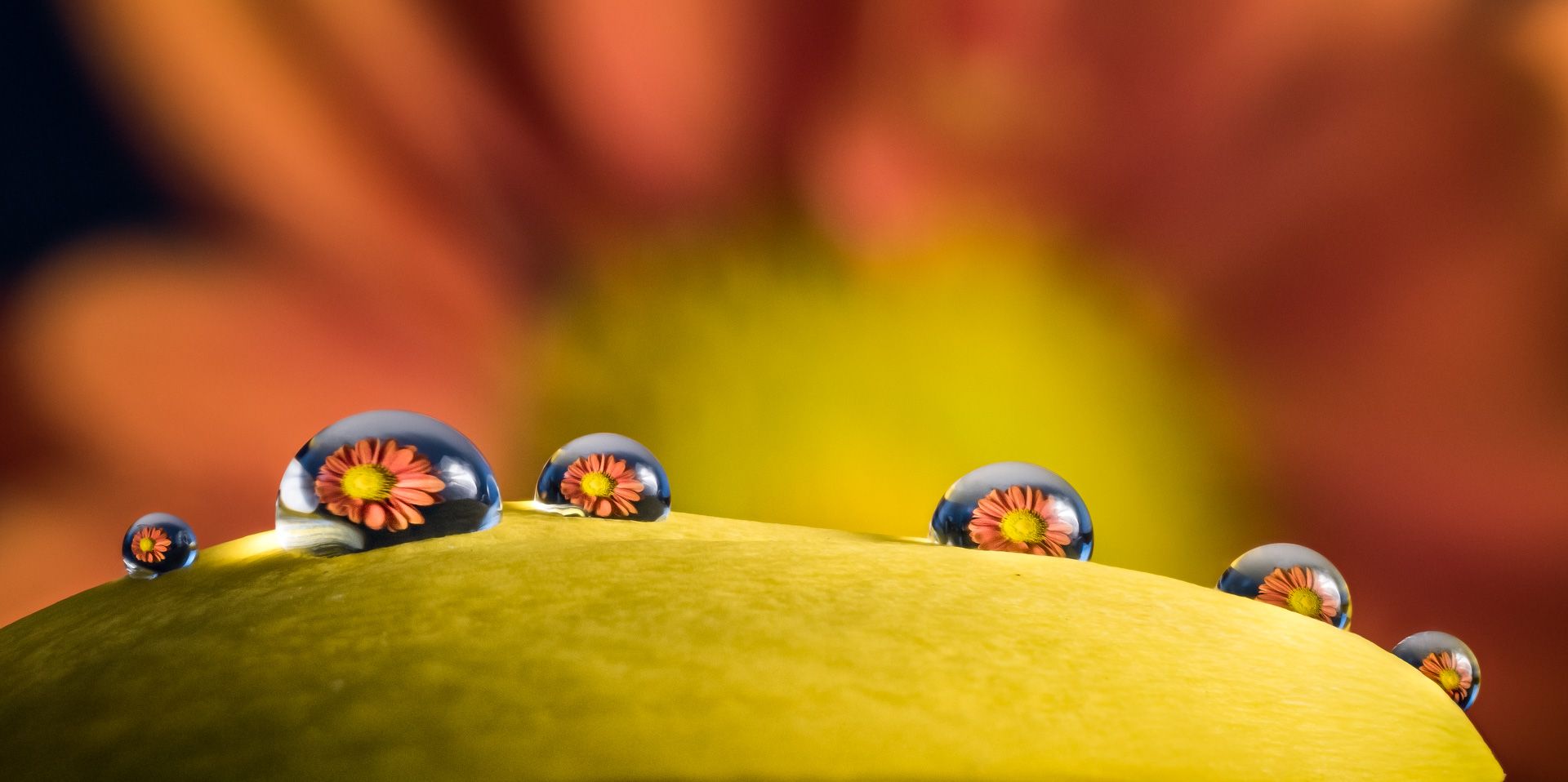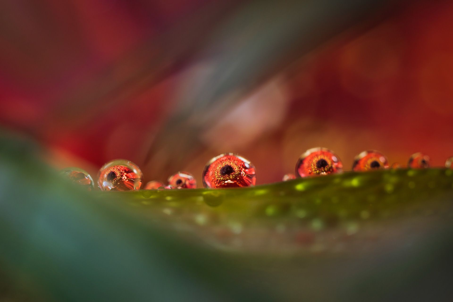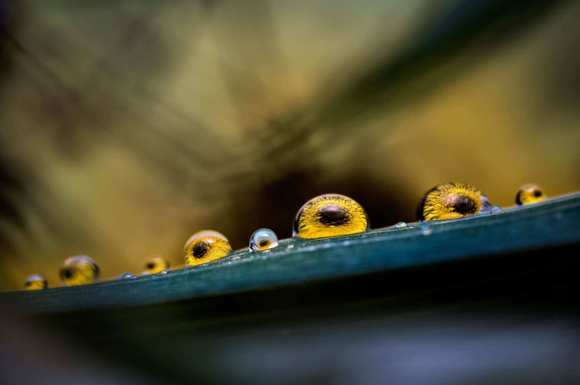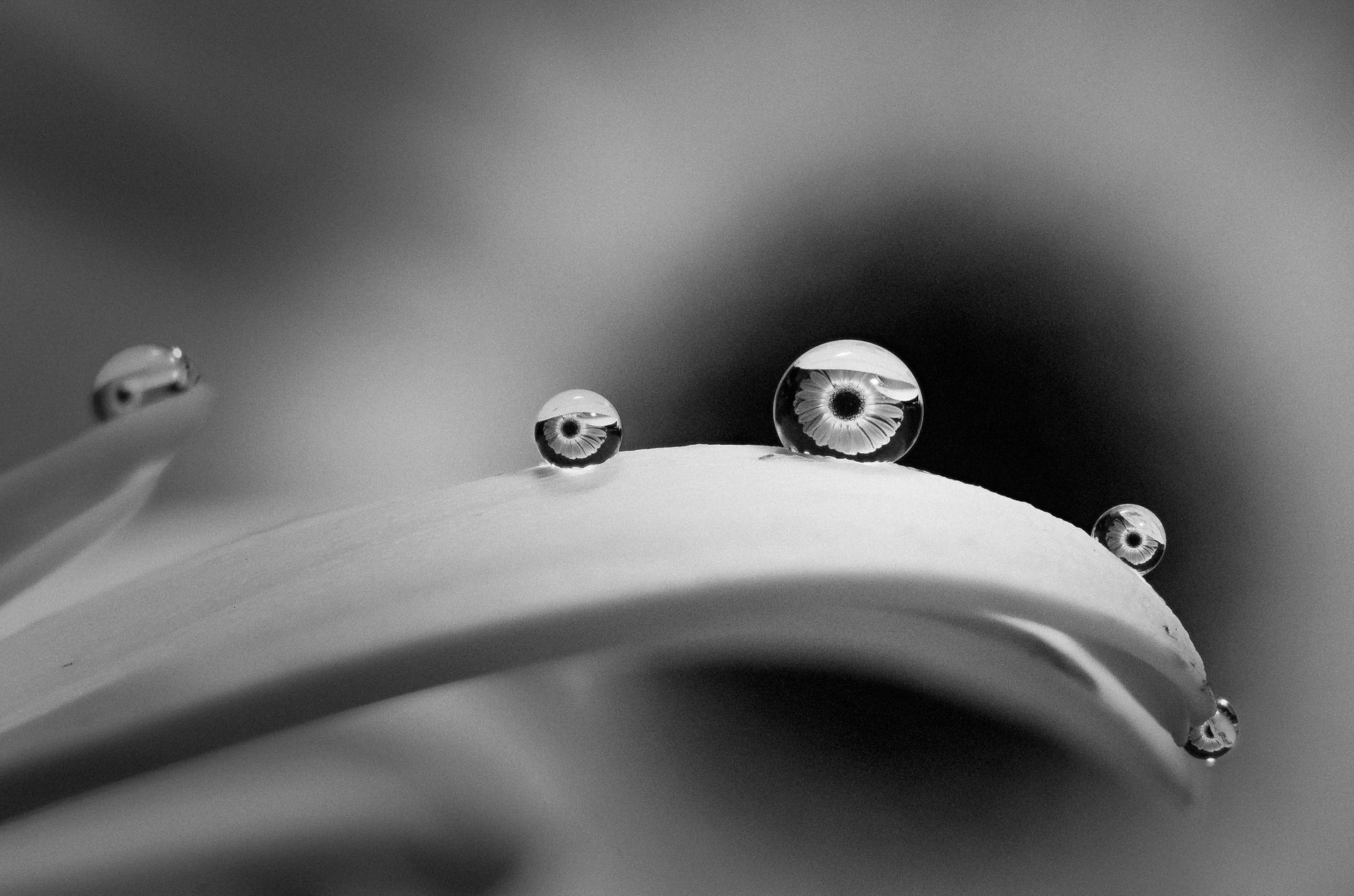- Las gotas están posadas sobre pétalos, césped o plantas tipo cinta (Chlorophytum comosum)