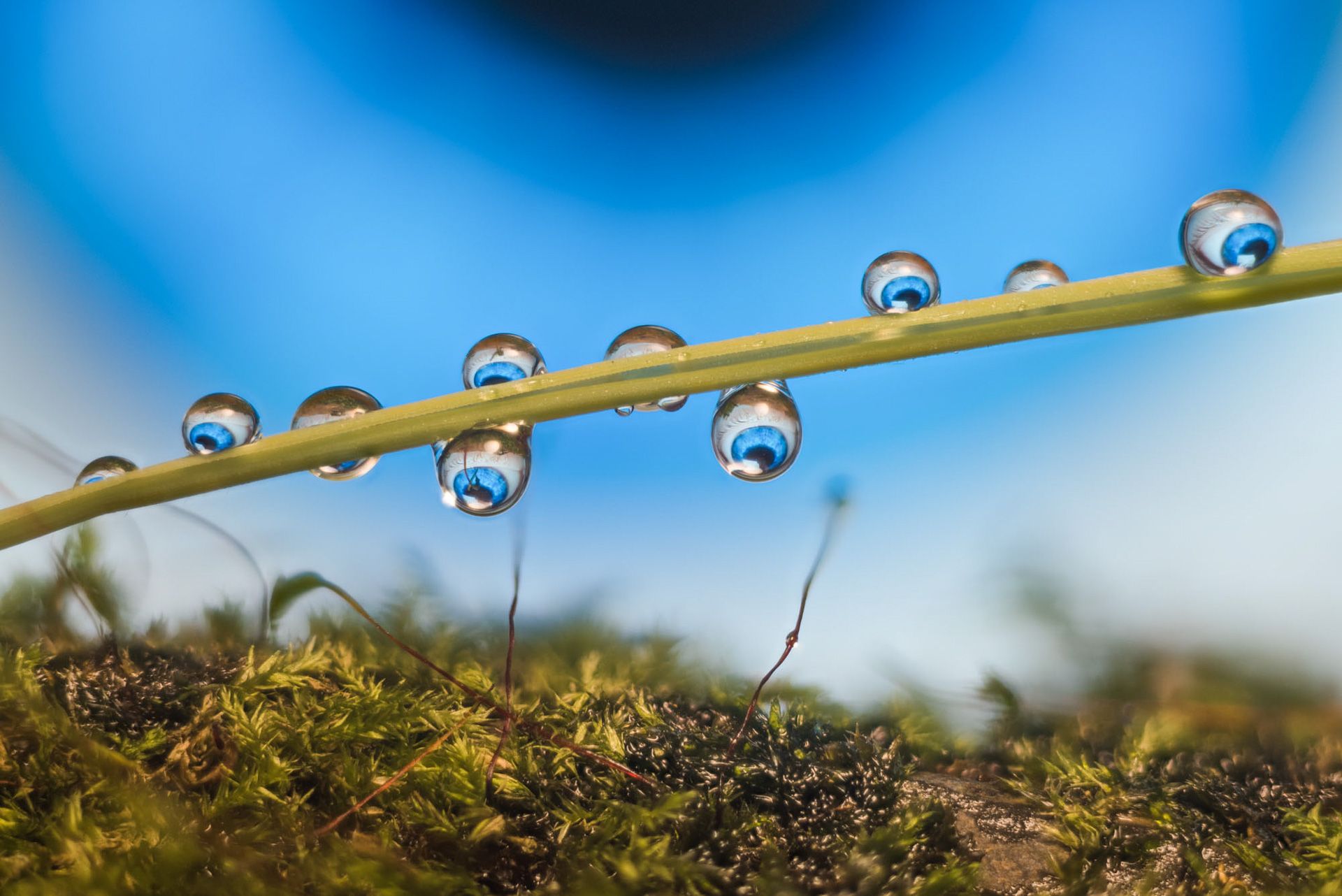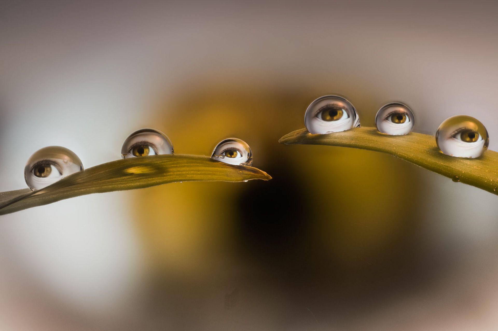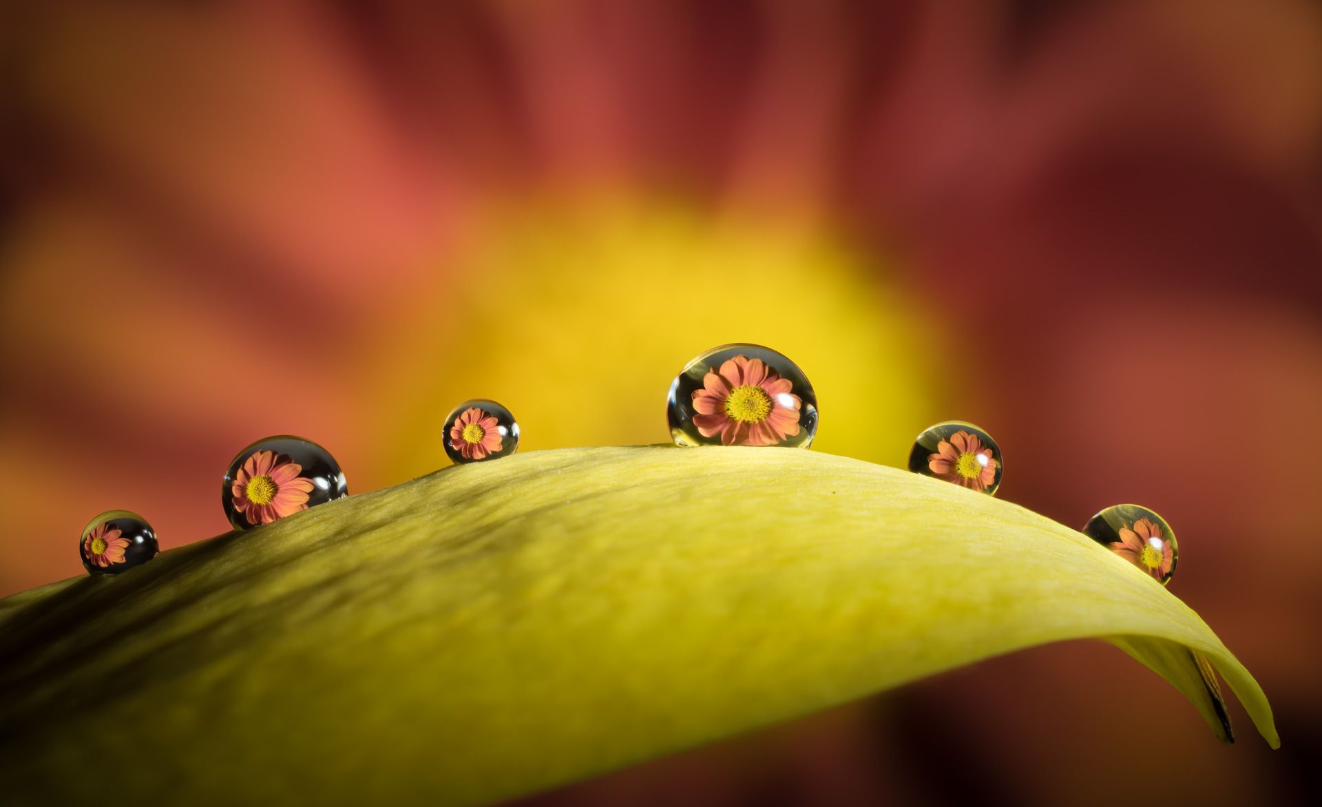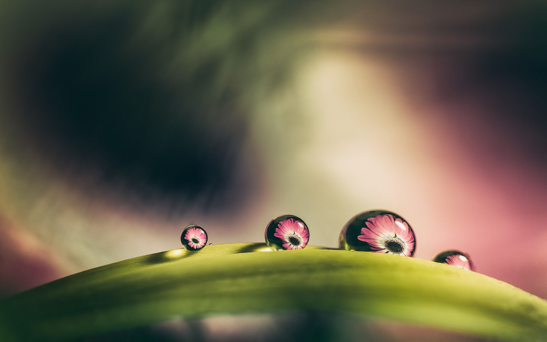 - Las gotas están posadas sobre pétalos, césped o plantas tipo cinta (Chlorophytum comosum)