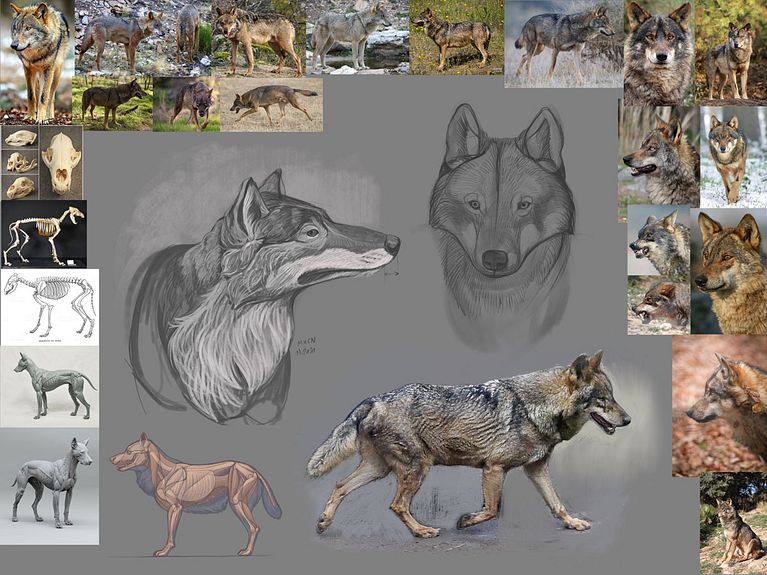 Antes de cada proyecto me gusta reunir tanta información como me sea posible, creando un mural de referencias en el que intento añadir tanto referencias encontradas en internet, como bocetos, fotografías propias y estudios de anatomía. En este caso hice una visita al Museo de Ciencias Naturales de Madrid y al Safari Madrid, para realizar bocetos tanto de ejemplares naturalizados como del animal vivo, para comprender mejor su personalidad.