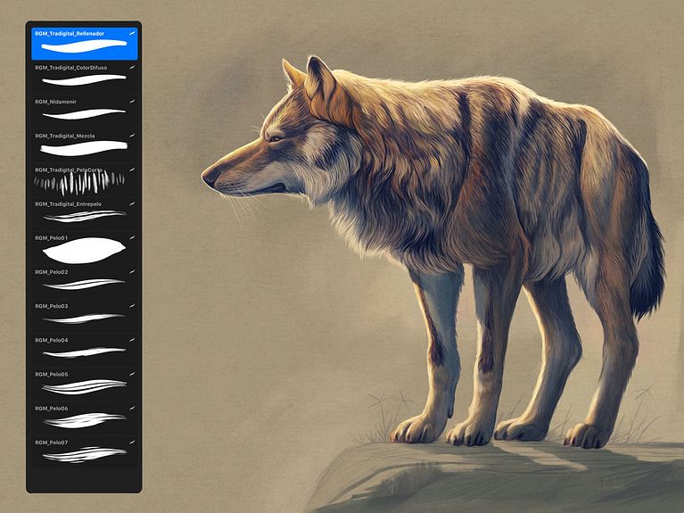 Para la imagen principal he empleado una técnica que permite un mayor nivel de realismo, también usando una construcción de capas con diferentes modos de fusión para trabajar el color, las luces y las sombras por separado. Para realizar el pelaje del animal Procreate nos permite crear pinceles personalizados para resolver con más eficacia los diferentes tipos de pelo del animal.