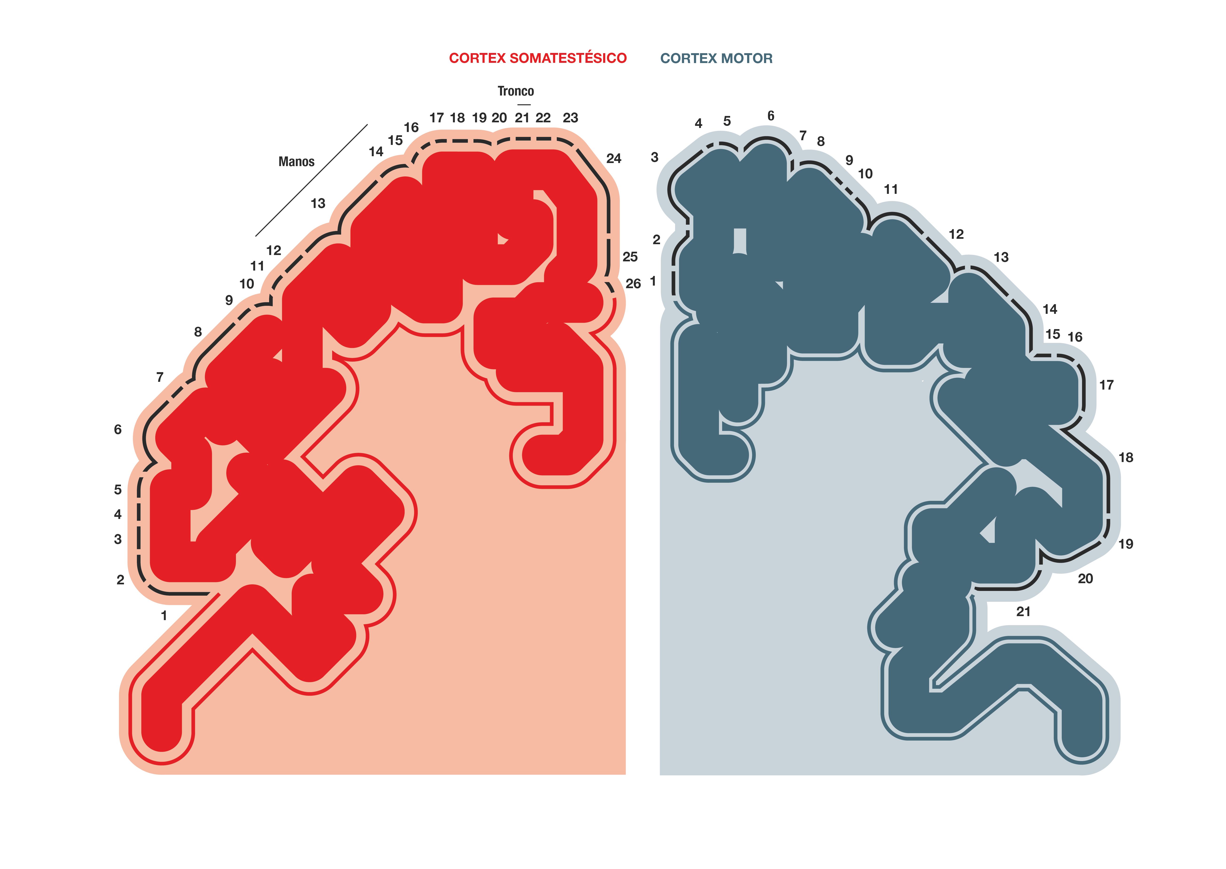 Cada una de las partes de nuestro cuerpo esta inervada por una parte concreta de nuestra corteza cerebral. Es decir: cada parte del cuerpo dispone de una parte de nuestro cerebro en exclusiva, tanto en el aspecto sensitivo (córtex somatestésico) como en el motriz (córtex motor). Ambas partes, sensitiva y motor, están localizadas en lugares del cerebro diferentes.