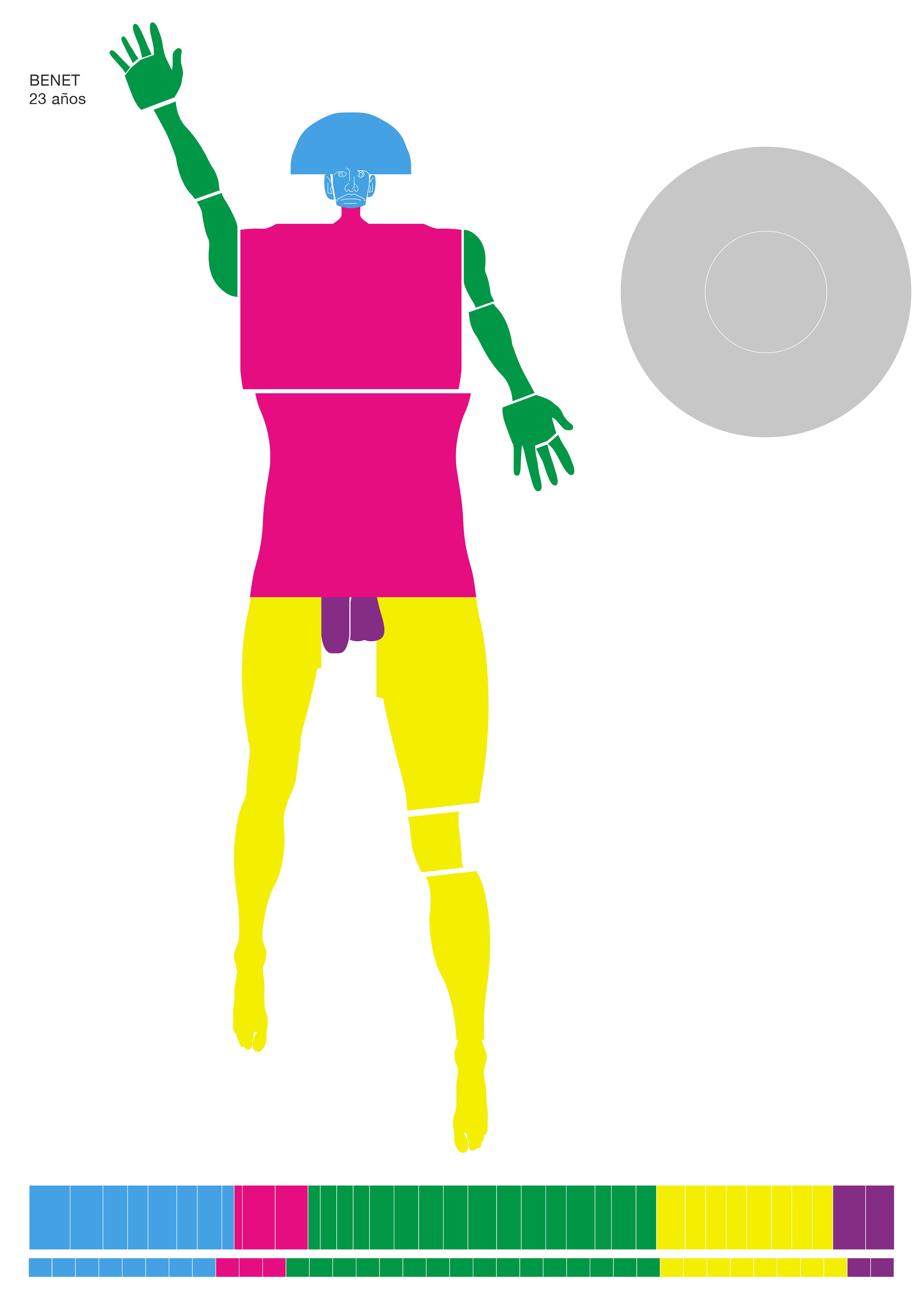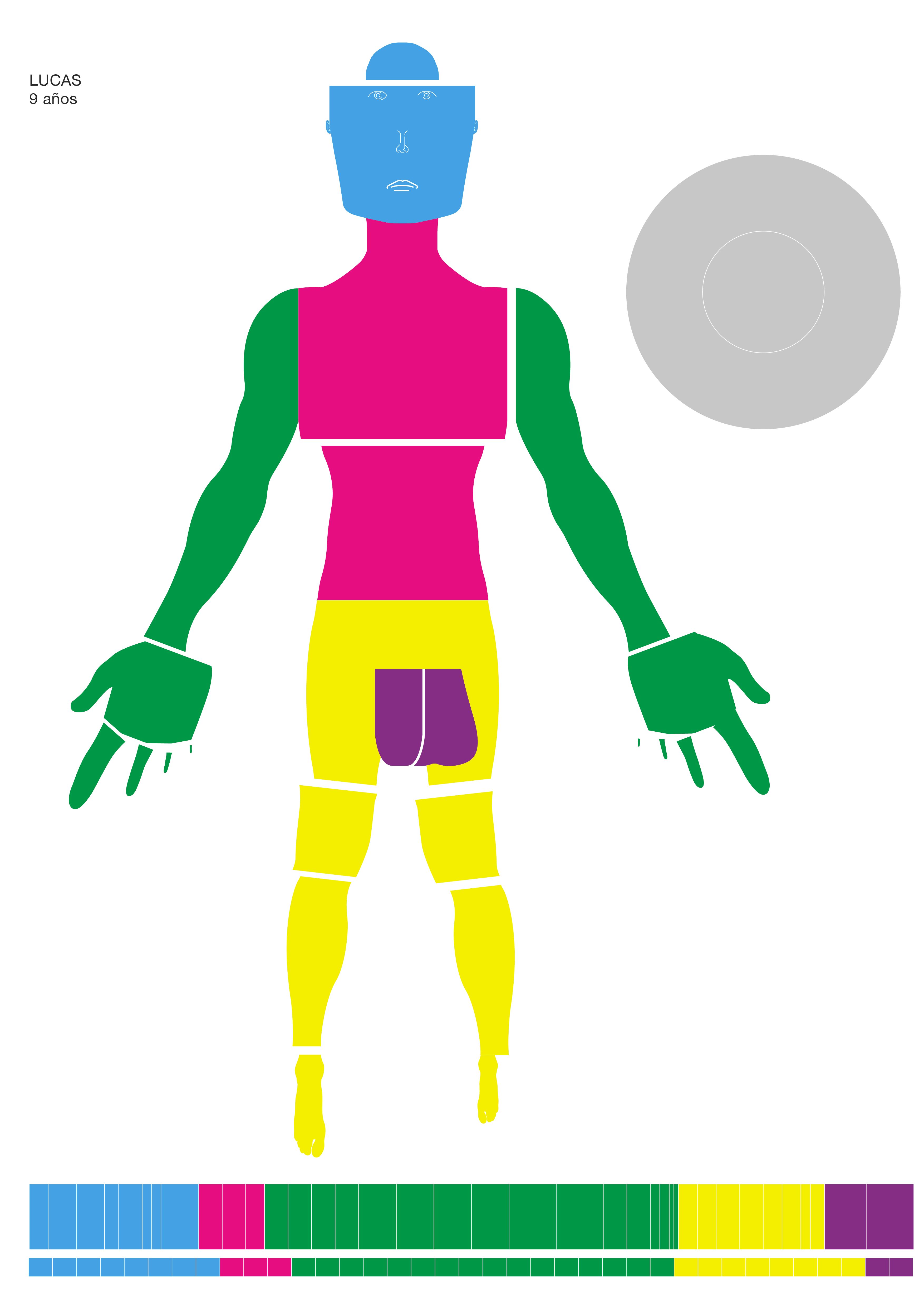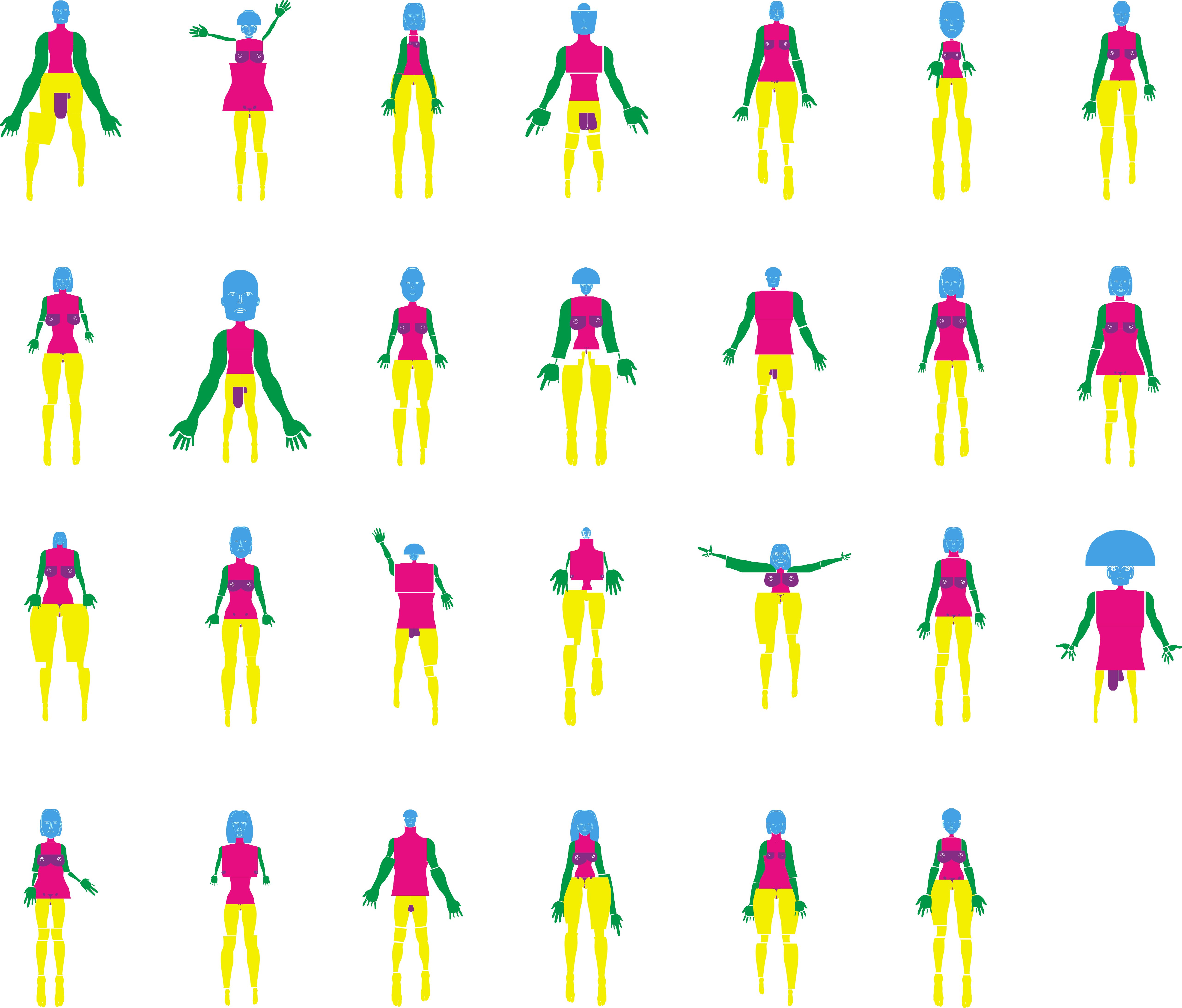 1 Abdomen. 2 Garganta. 3 Lengua. 4 Dientes y encías. 5 Labio inferior. 6 Boca. 7 Labio superior. 8 Rostro. 9 Nariz. 10 Ojo y párpado. 11 Ceja. 12 Pulgar. 13 Dedos. 14 Mano. 15 Muñeca. 16 Antebrazo. 17 Codo. 18 Brazo. 19 Hombro. 20 Cuello y cabeza. 21 Tronco. 22 Cadera. 23 Pierna. 24 Pie. 25 Dedos de los pies. 26 Genitales.