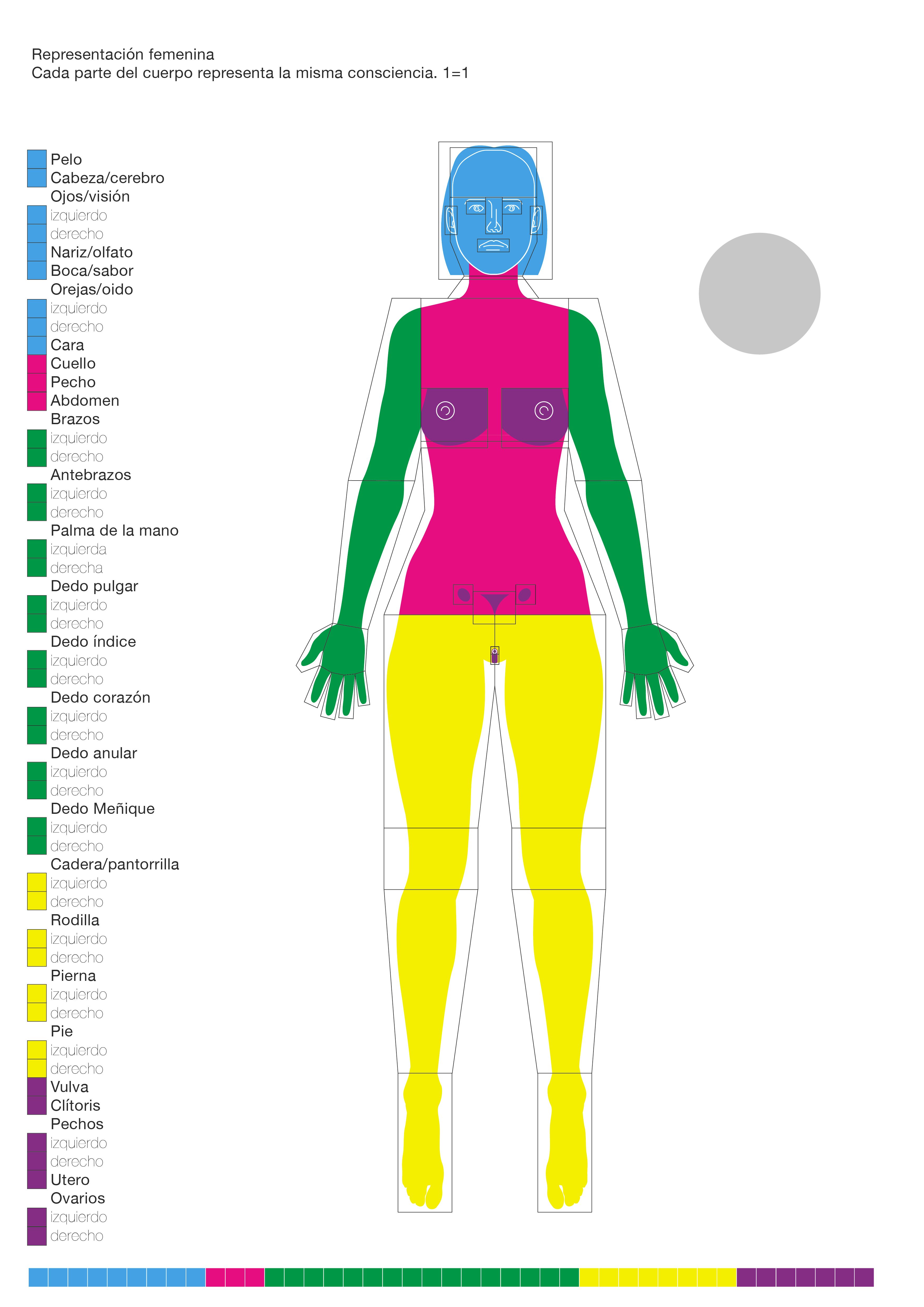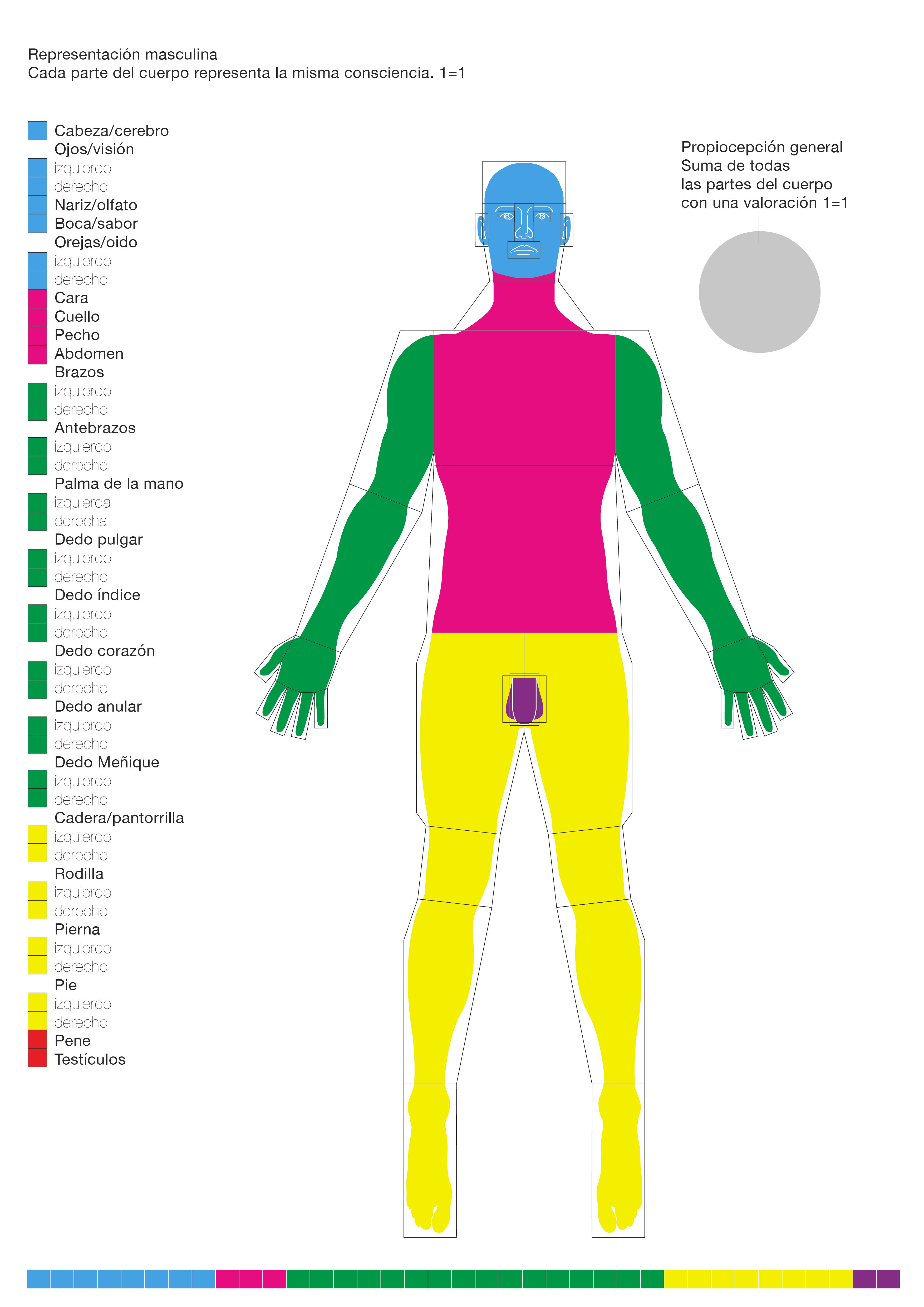 Se le pidió a cien personas (cincuenta hombres y cincuenta mujeres) que valoraran la percepción de cada parte de su cuerpo del 0 al 10. Cero representa la inconsciencia, uno la consciencia y diez la hiperconsciencia.