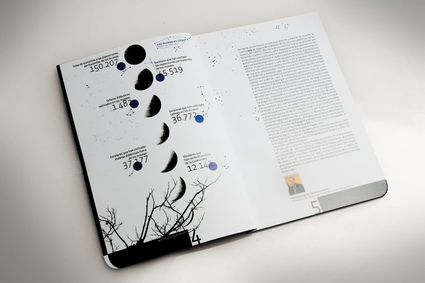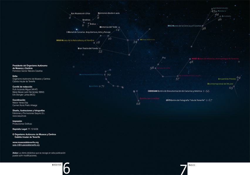 En este caso, el número se dedicaba al Museo de la Ciencia y el Cosmos; junto con otro diseñador se hizo la maquetación, pero las páginas genéricas (introducción, índice, Museos en cifras...) fueron mi cometido. Partiendo de recursos como las estrellas, las fases lunares, constelaciones... generé un mundo de recursos para estas páginas.