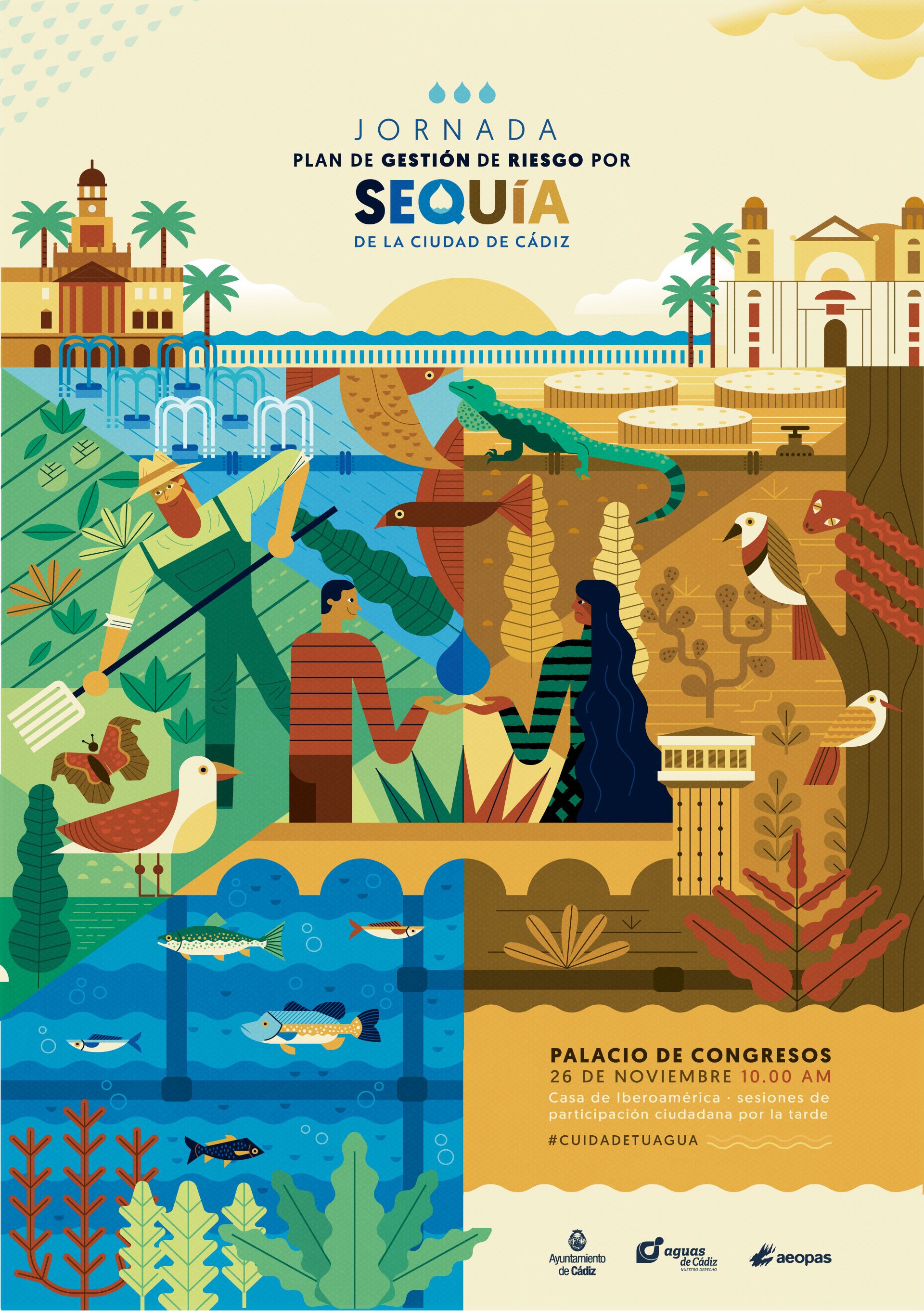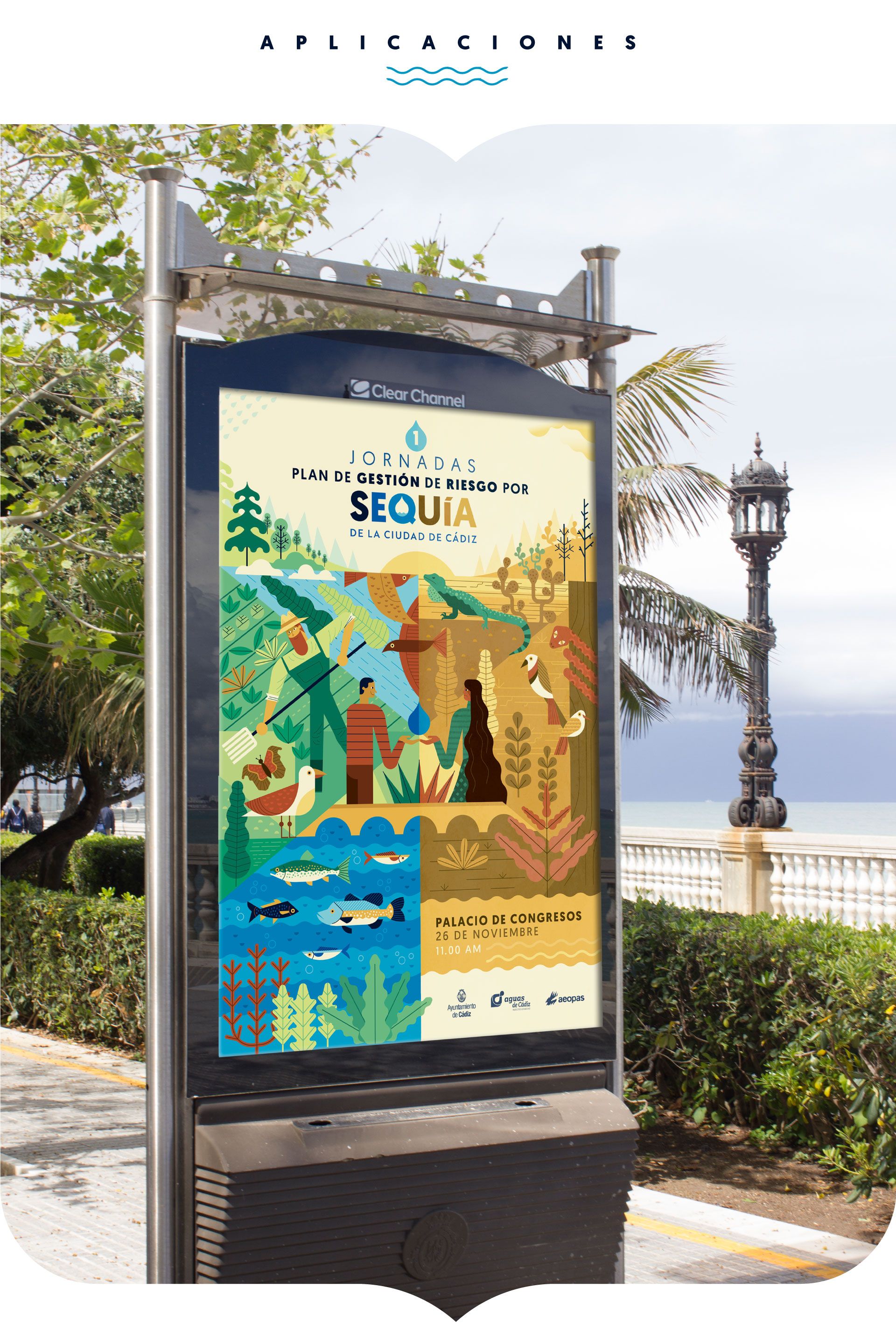 En estas jornadas se presentó el Plan de Gestión de Riesgo por Sequía de la ciudad de Cádiz y tuvieron lugar en noviembre de 2019 en el Palacio de Congresos de Cádiz. Realizamos todas las ilustraciones diferentes aplicaciones de diseño a partir del cartel ilustrado que realizamos para las Jornadas sobre sequía, desde lonas, displays, carpetas o folios corporativos hasta banners o pantallas publicitarias exteriores. Un encargo que nos fue realizado por la empresa pública Aguas de Cádiz