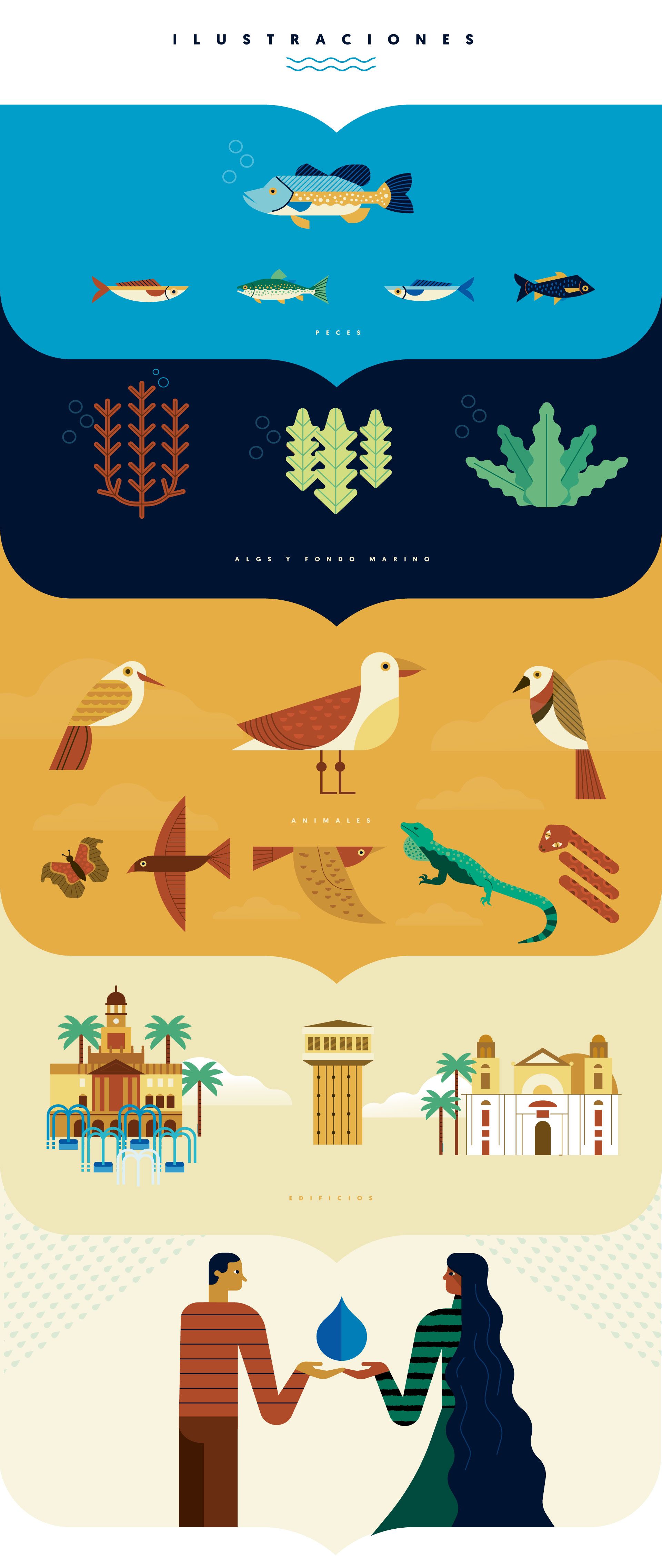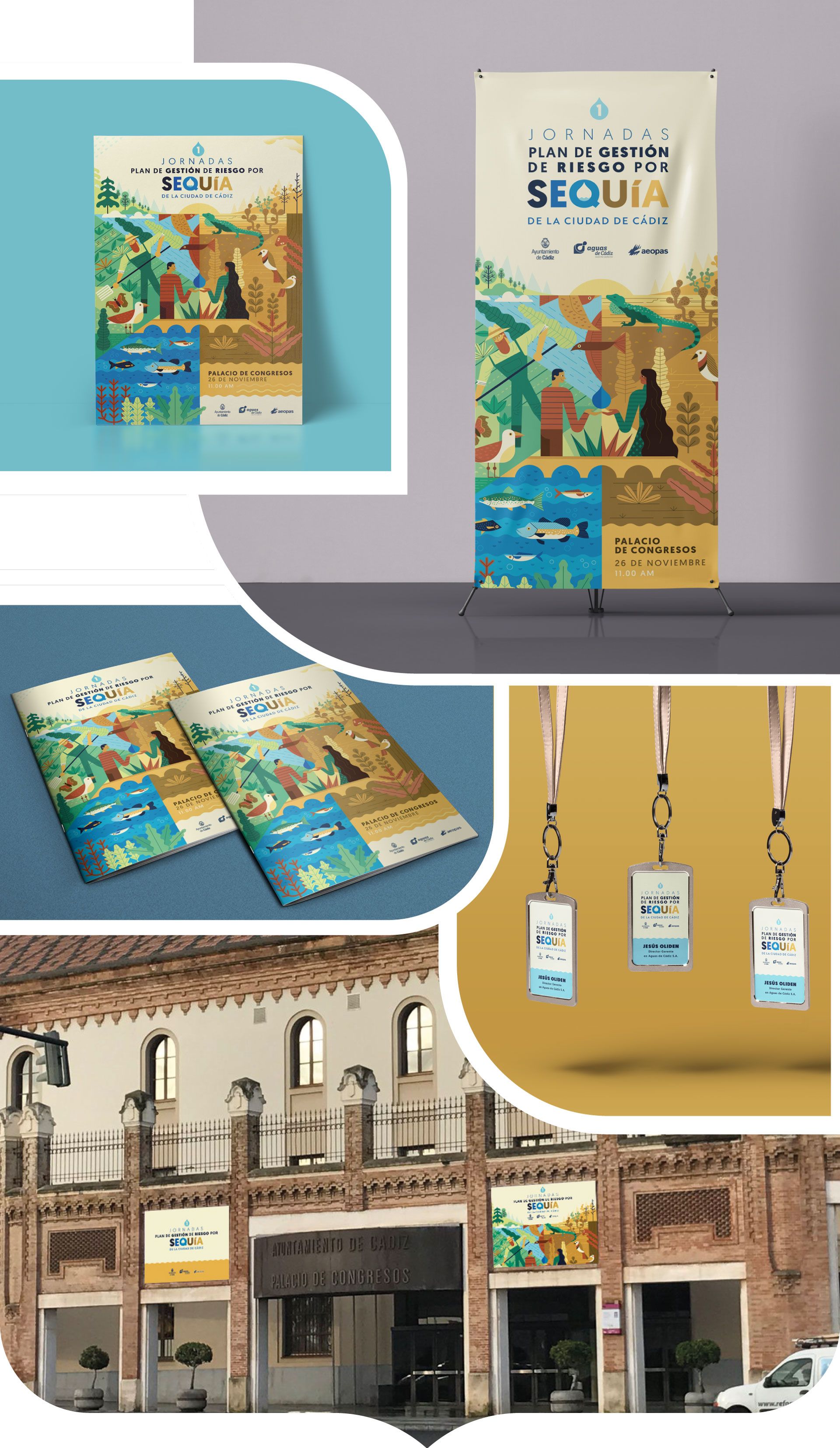 These conferences presented the Drought Risk Management Plan for the city of Cádiz. They took place in November 2019 at the Cádiz Conference Center. We created all the illustrations using different design applications based on the illustrated poster we created for the Drought Conference, from banners, displays, folders, and corporate folios to outdoor advertising banners and screens. This was commissioned by the public company Aguas de Cádiz.