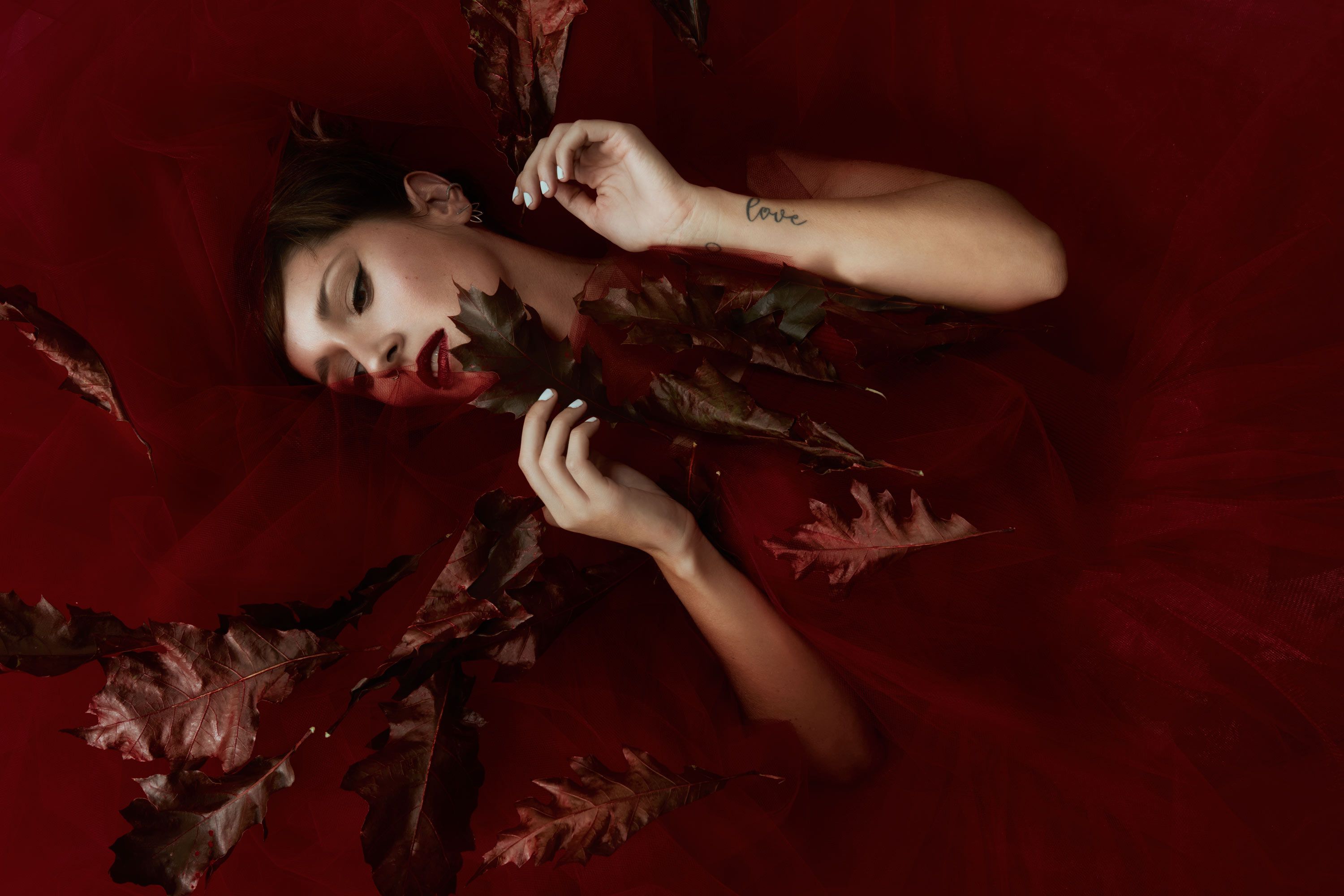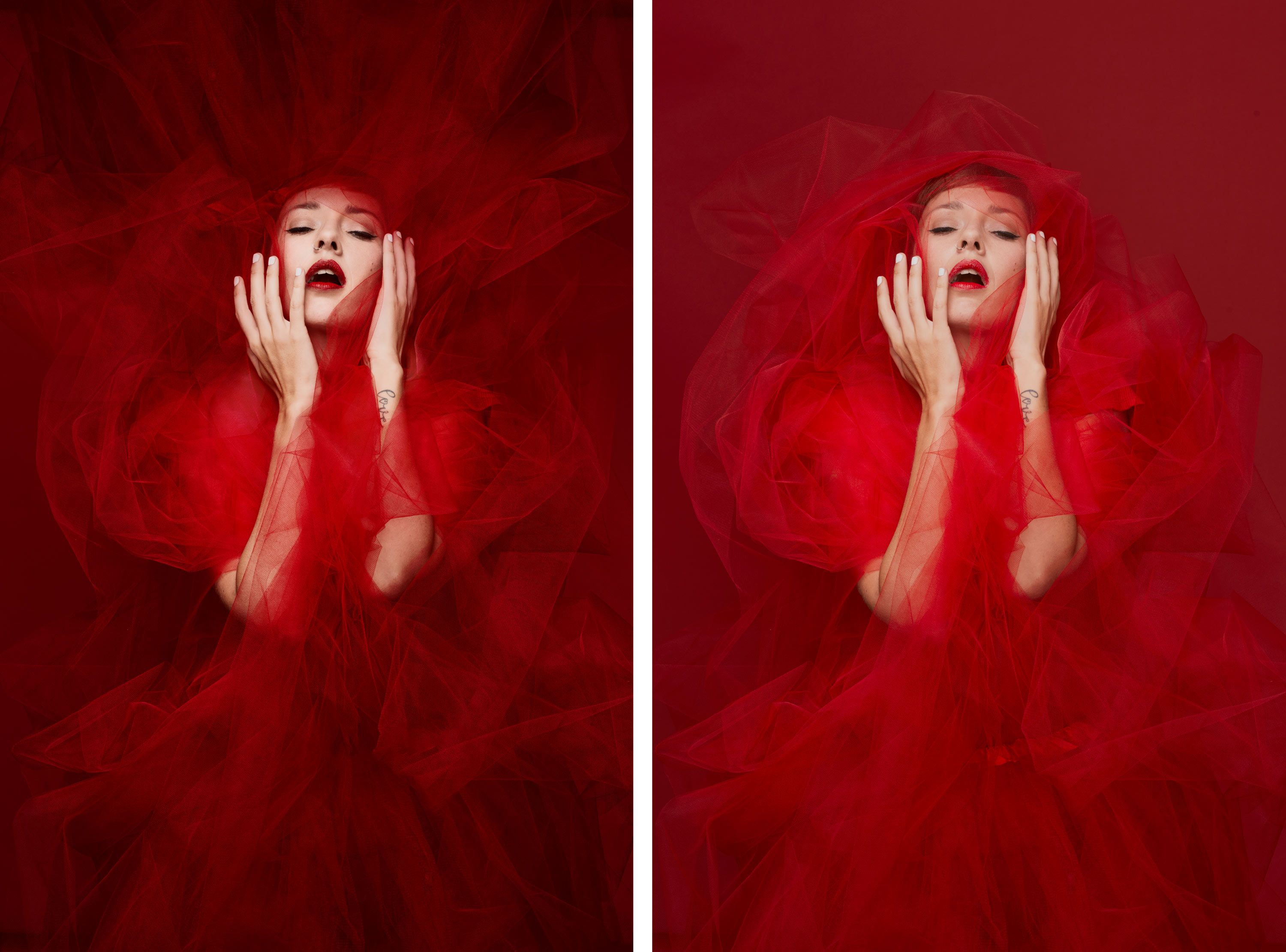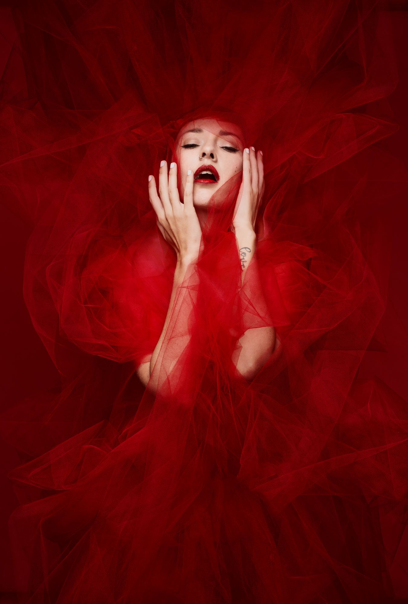 In this work I have tried to create portraits with a dramatic touch, using a single color for the entire image and taking different overhead shots with various levels of fabric to achieve greater volume in the image.
