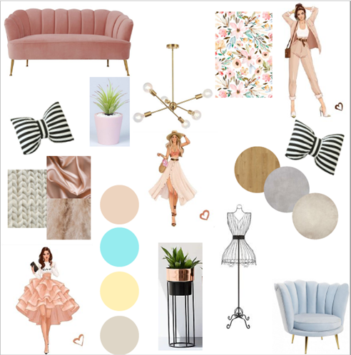 Se puede observar en el moodboard que se utilizo una paleta de colores pasteles con el rosado, celeste, amarillo y violeta también, se observa el mobiliario, bocetos de ropa, vegetación, papel tapiz, texturas y distintos tipos de suelo que se usara en el proyecto.