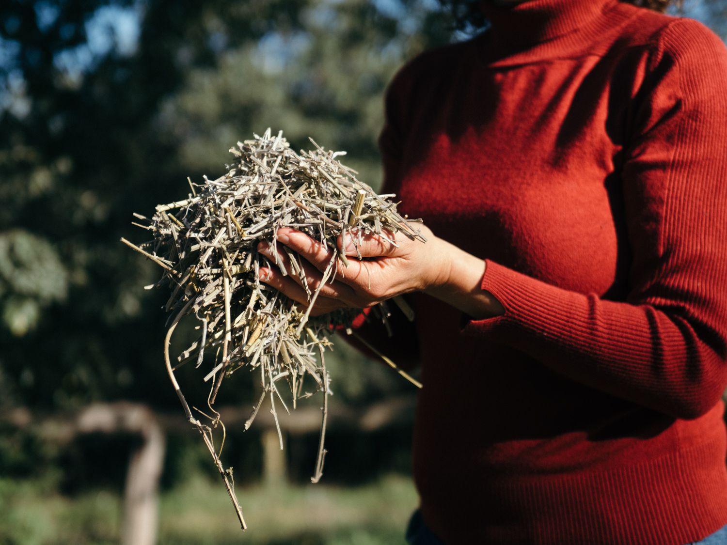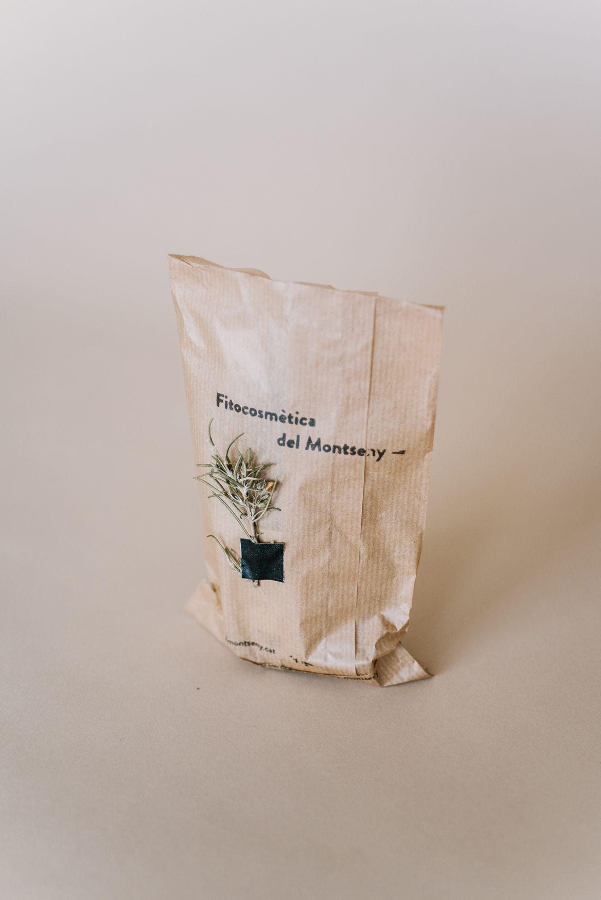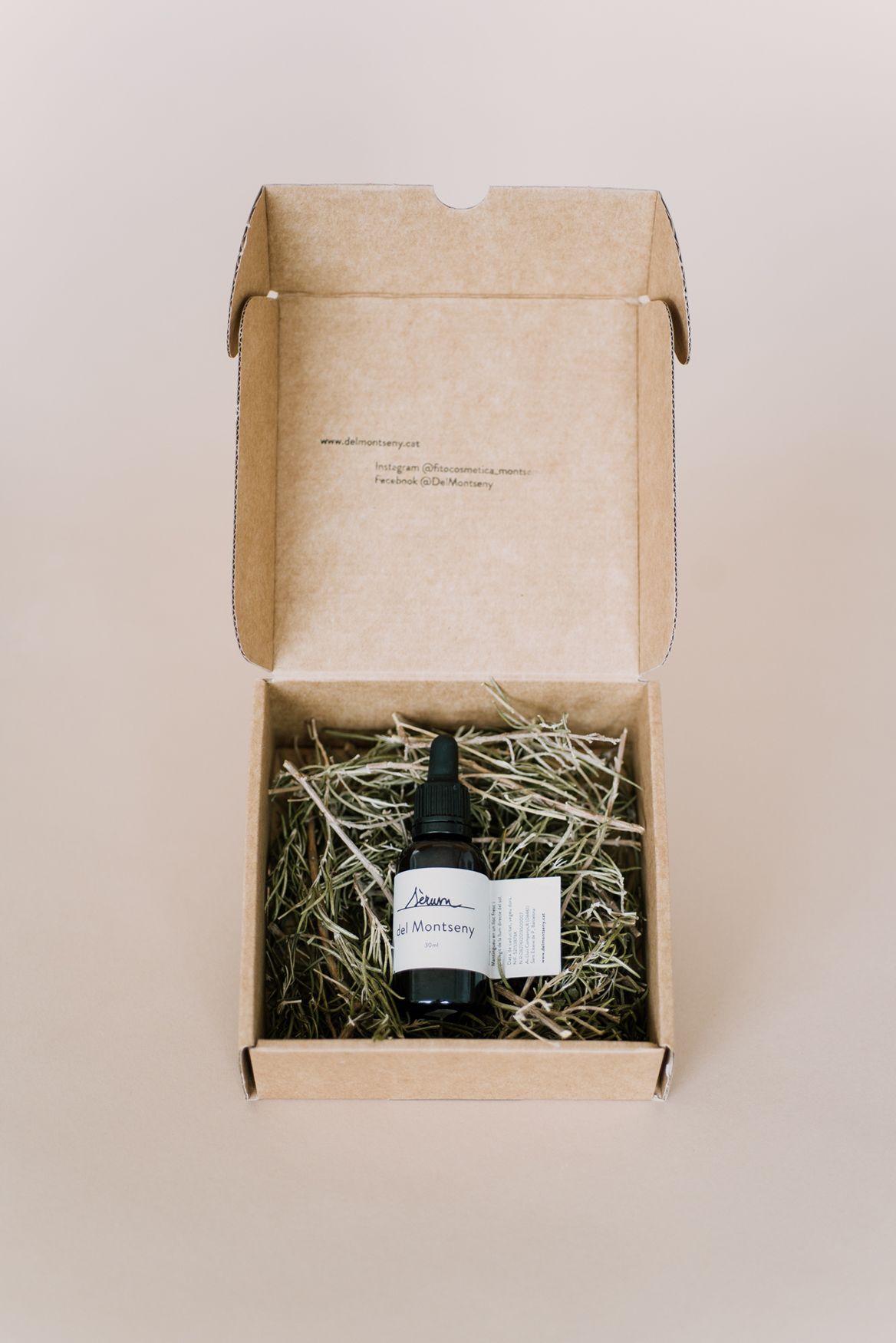 Para entrar en la economía circular, decidimos darle una segunda vida a los residuos generados durante el proceso de creación. En el momento de la maceración, al quitar la flor de su tallo, los tronquitos sobrantes son cortados para poder ser aprovechados como protección de los envases durante los envíos. Como son plantas aromáticas, al abrir la caja del producto creamos la sensación de estar en la naturaleza, más concretamente, de estar dentro de los bosques del Montseny.