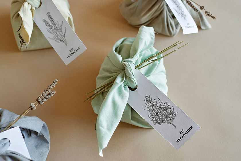 Al año siguiente, creamos unos kits sobre diferentes tipologías: kit hidratante, kit reparador, kit limpiador y kit terapéutico. Todos ellos van envuelto con telas recuperadas teñidas con las plantas más representativas de cada kit y un librito con las propiedades de las plantas y las características de cada producto.